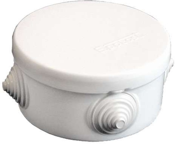 Компания Мегасвет предлагает вам оптом и в розницу Коробка распаячная открытой установки 85х40мм (круг.), серая 4 входа ( герм.),IP54,(120),шт. по цене 49.50 рублей.