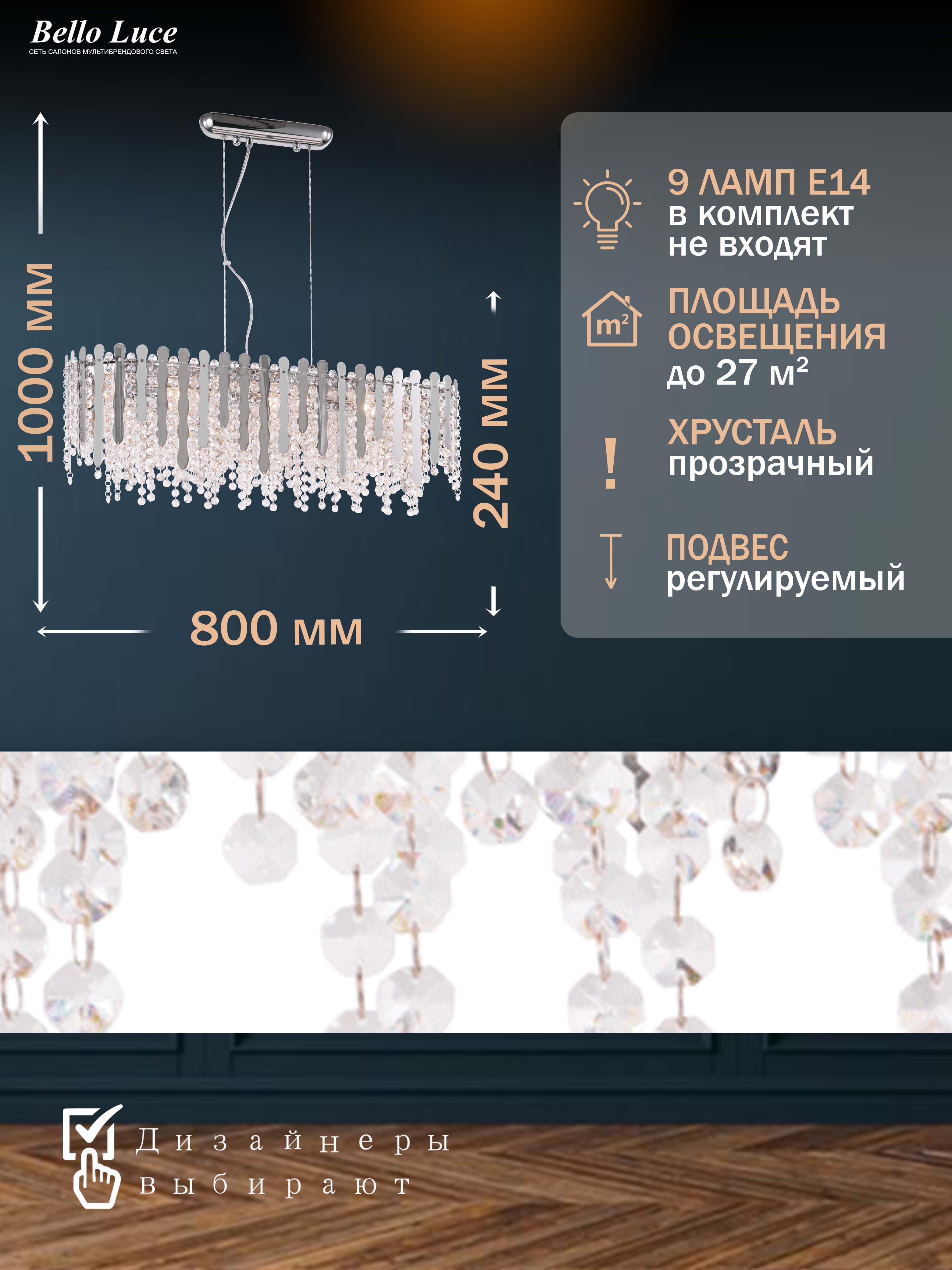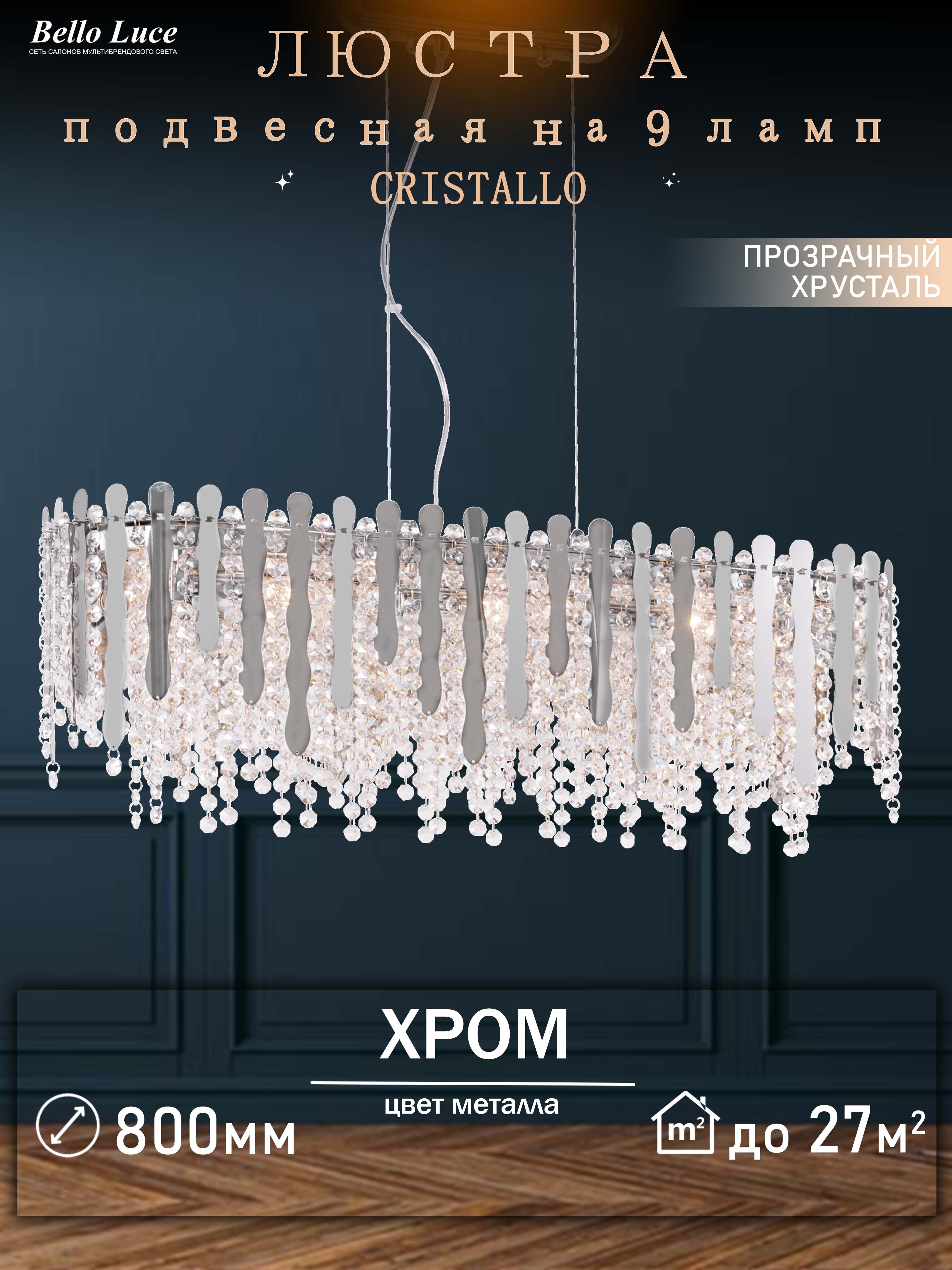 Компания Мегасвет предлагает вам оптом и в розницу Люстра Cristallo хрустальная хром подвесная с прозрачными хрустальными подвесками на 9 ламп E14, регулировка по высоте по цене 15631 рублей.
