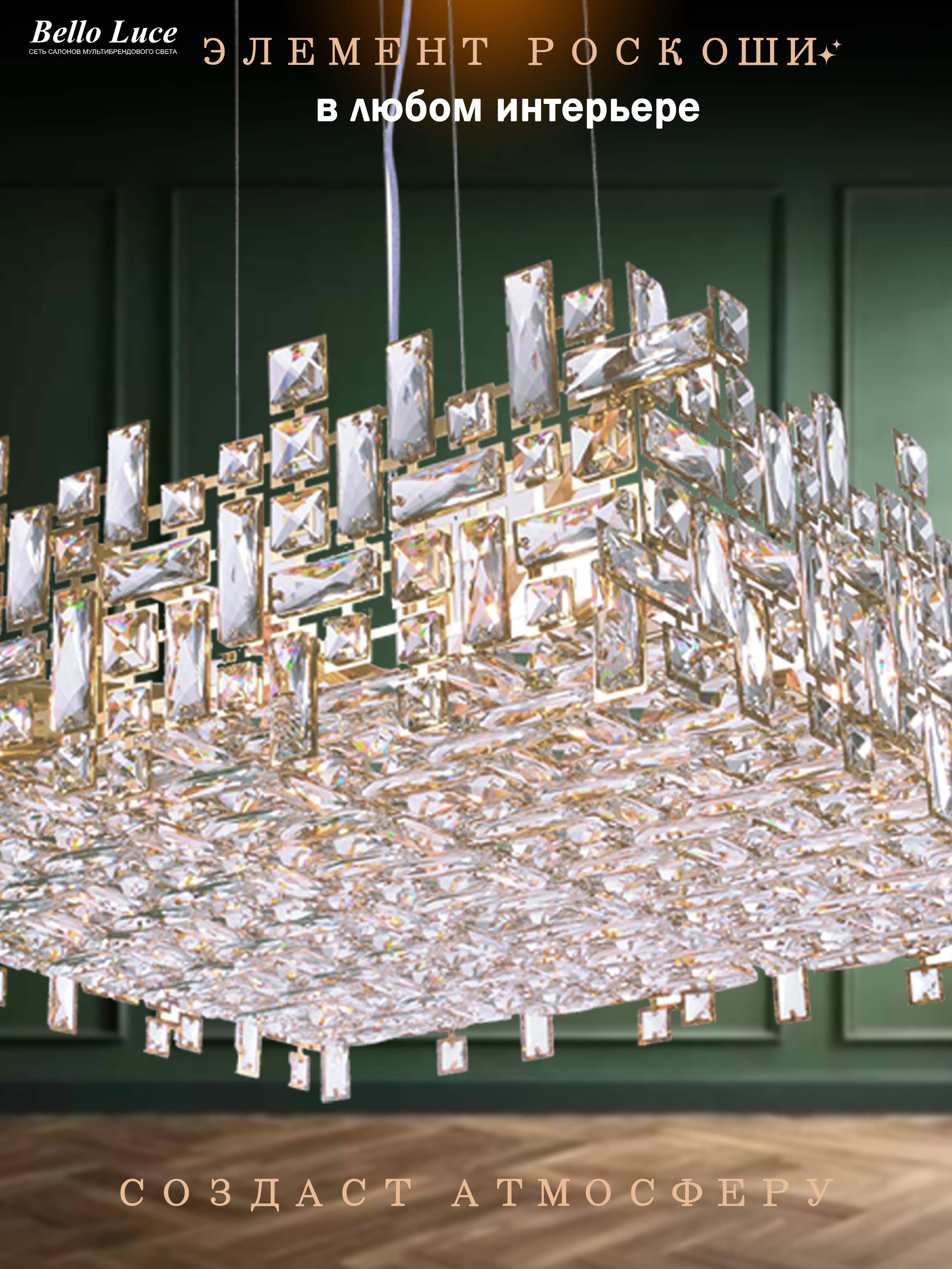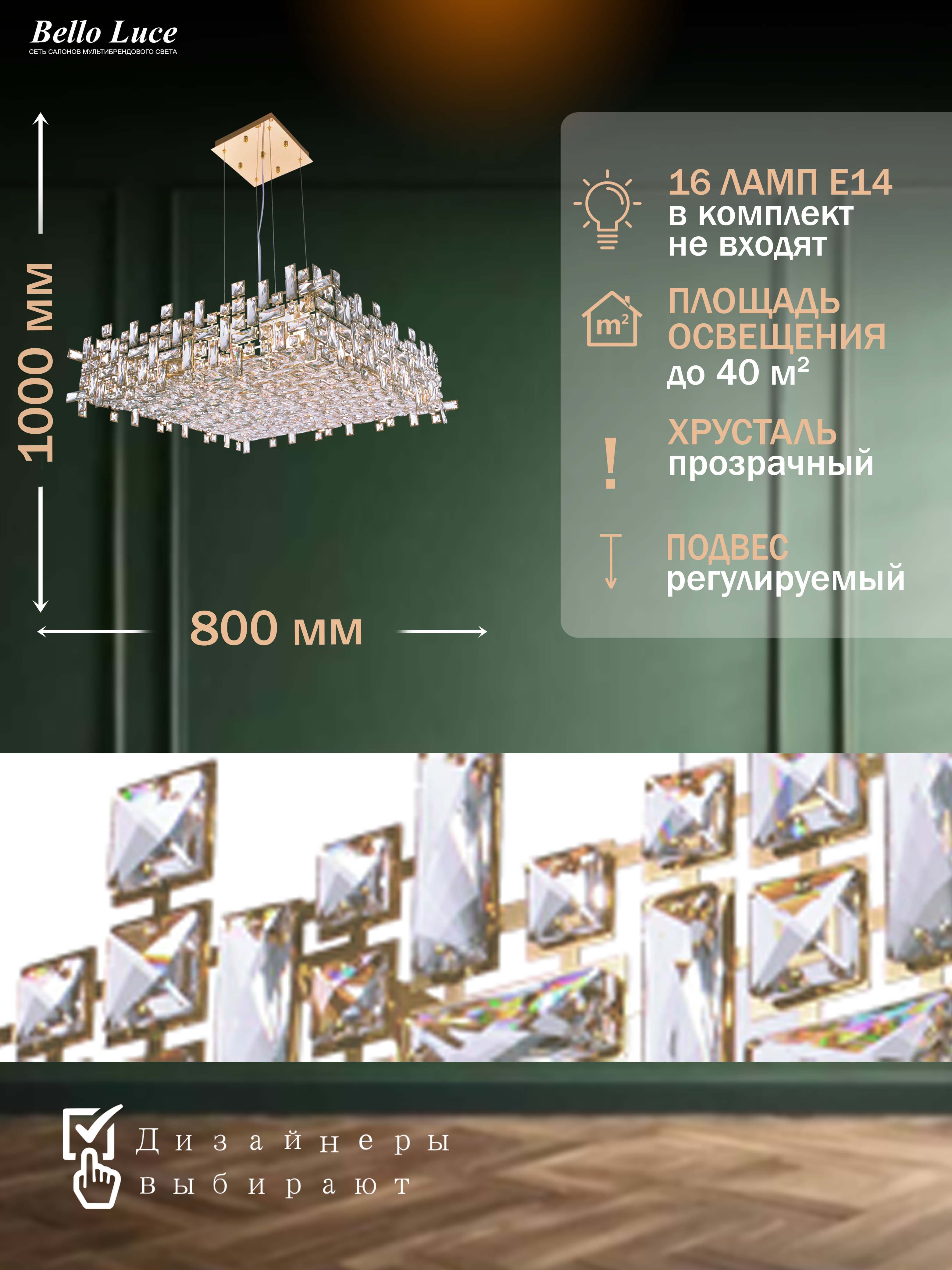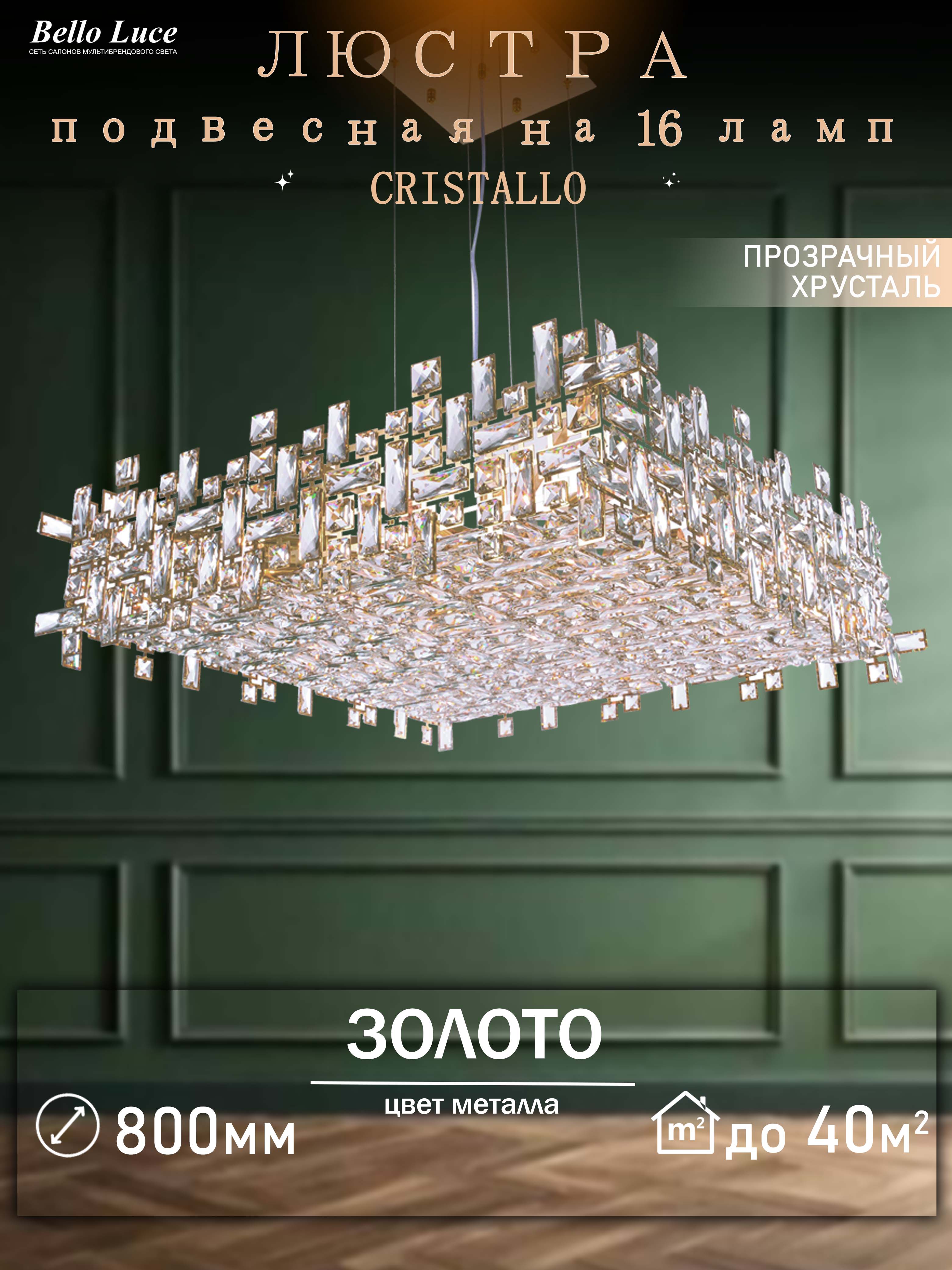 Компания Мегасвет предлагает вам оптом и в розницу Люстра Cristallo хрустальная подвесная золото квадратная с прозрачными хрустальными кристаллами на 16 ламп E14, регулировка по высоте по цене 48191 рублей.