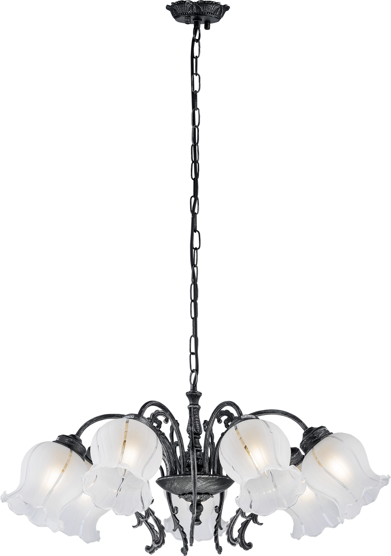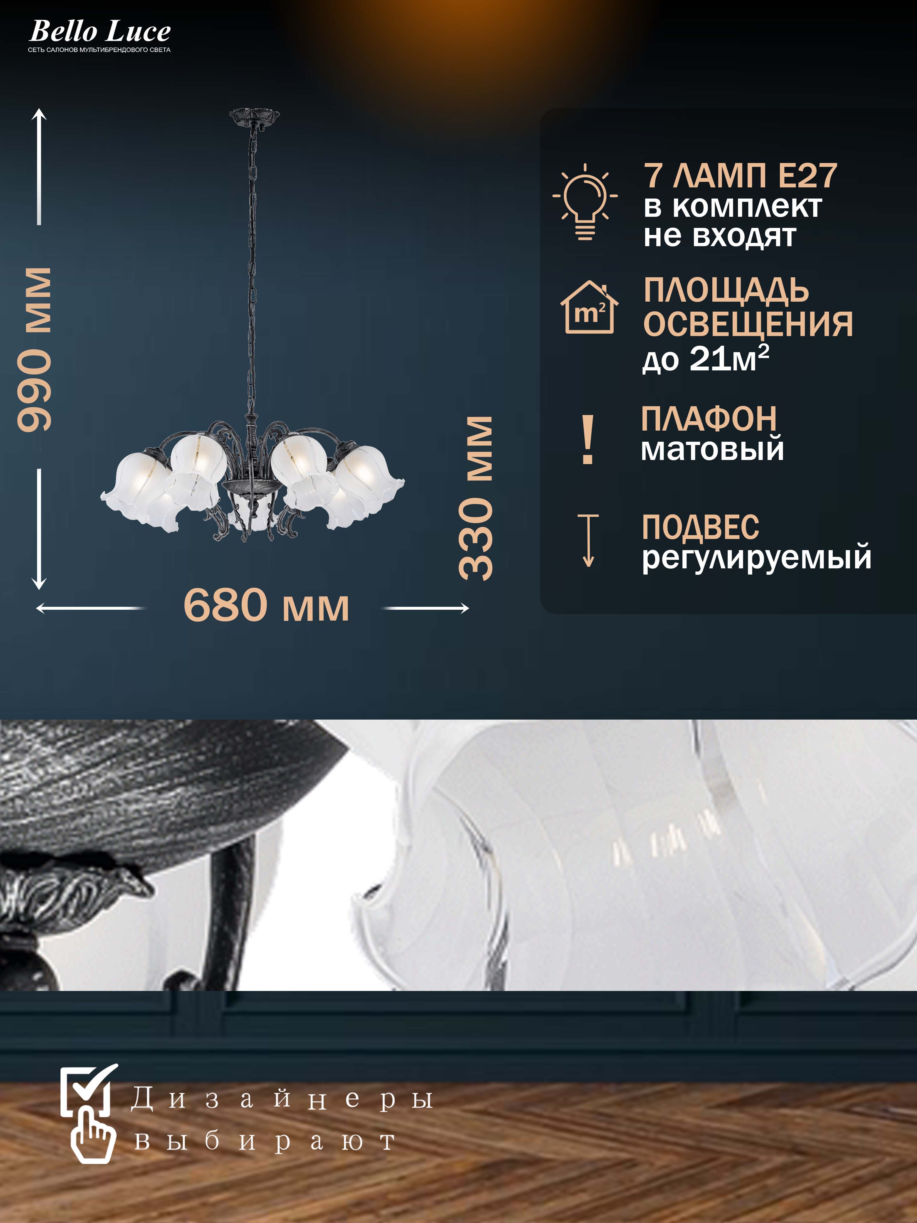 Люстра оснащена семью лампами с цоколем E27, что обеспечивает яркое и равномерное освещение. Для вашего удобства люстра легко регулируется по высоте с помощью декоративной цепочки. Вы можете использовать различные источники света, чтобы создать нужную атмосферу – от теплого света для уюта до яркого, холодного света для рабочих моментов. Благодаря своему дизайну, эта подвесная люстра станет центром притяжения на любом потолке.