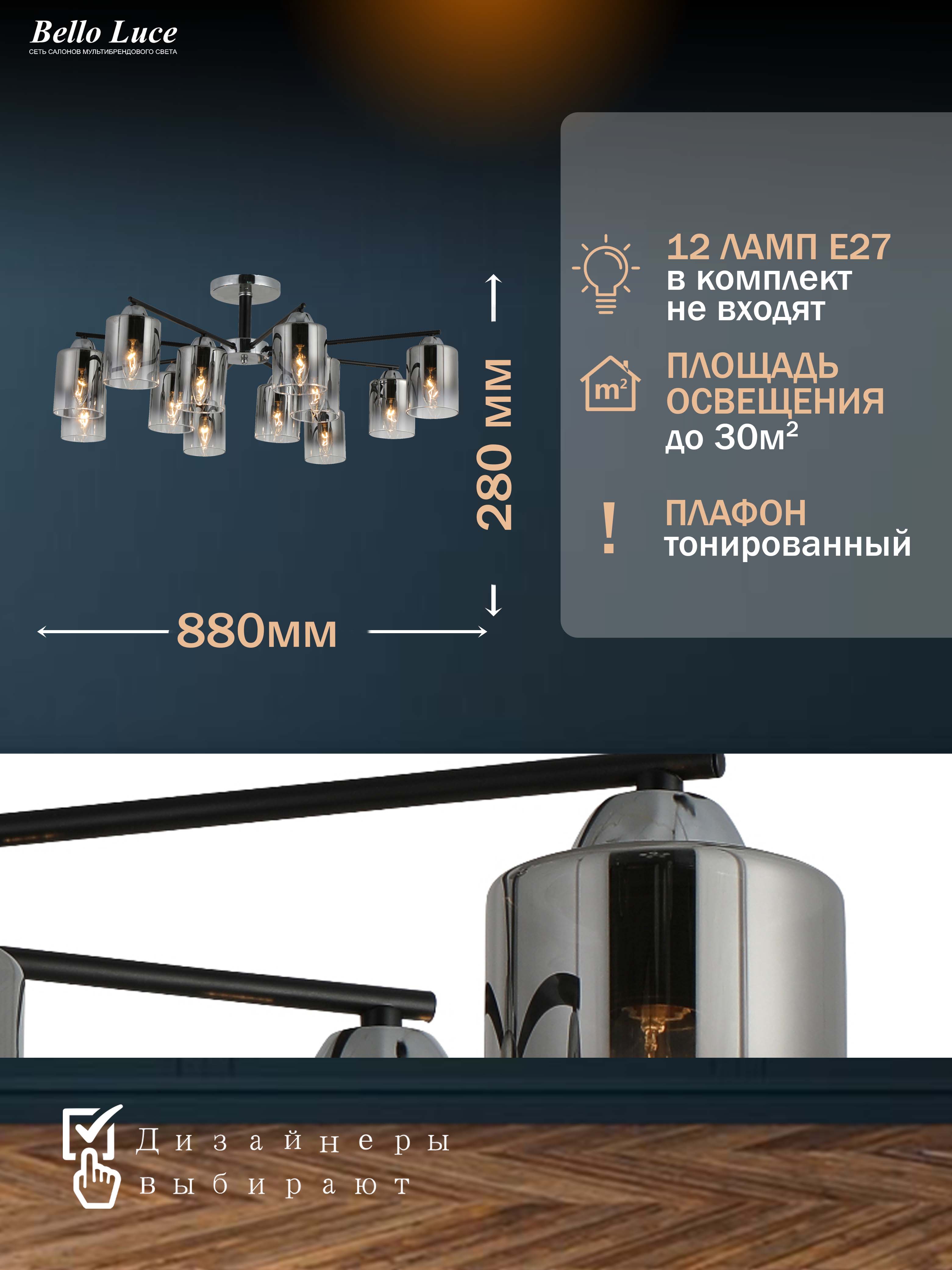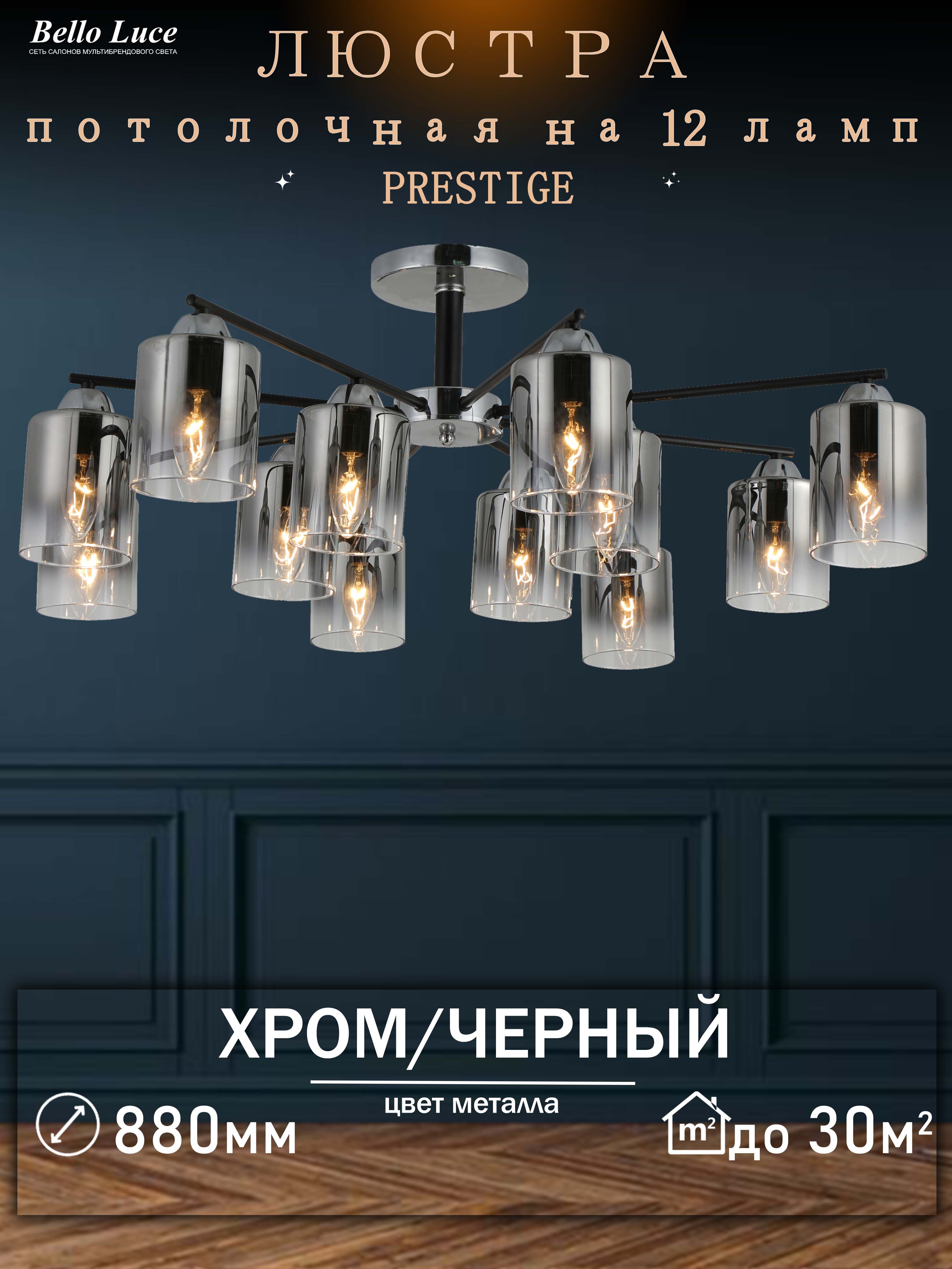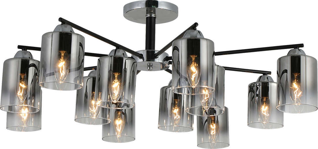 Компания Мегасвет предлагает вам оптом и в розницу Люстра Престиж потолочная черная+хром с тонированными плафонами на 12 ламп E27 по цене 0 рублей.