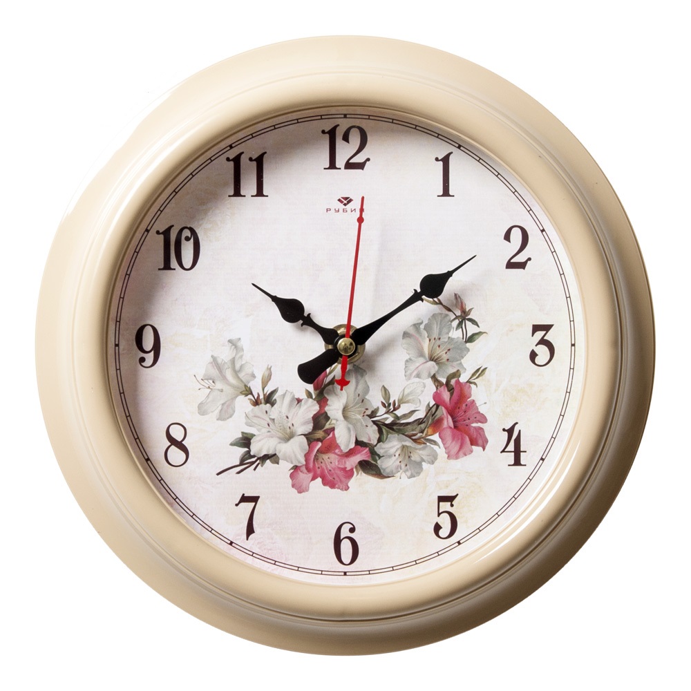 Компания Мегасвет предлагает вам оптом и в розницу Часы настенные "Цветение" круг, бежевый d210mm по цене 495 рублей.