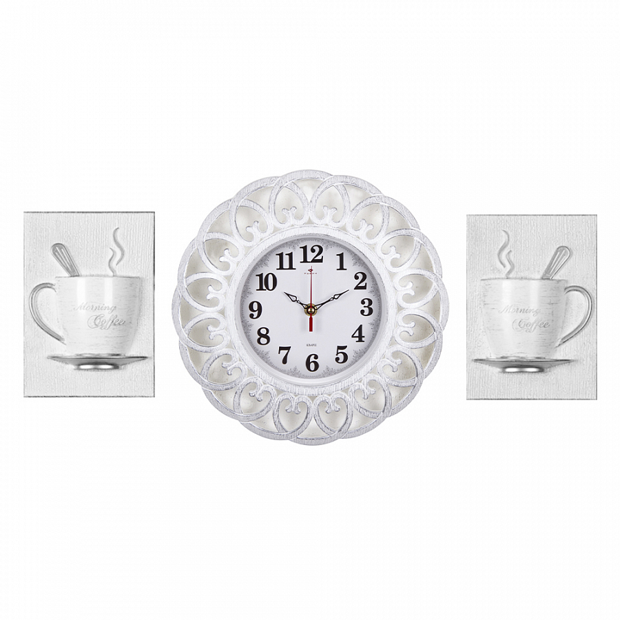 Компания Мегасвет предлагает вам оптом и в розницу Часы настенные "Классика" круг, белый с серебрянный d300mm+2 чашки по цене 1220 рублей.