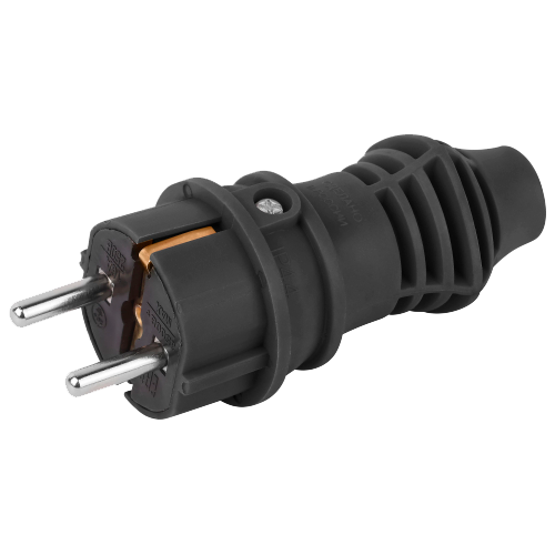 Прямая чёрная каучуковая вилка с заземлением из серии каучуковых разъёмов российского производства. Имеется аналог в красном цвете. Рассчитана на нагрузку до 16 А и позволяет подключать кабель КГ сечением до 3x2.5 мм².
