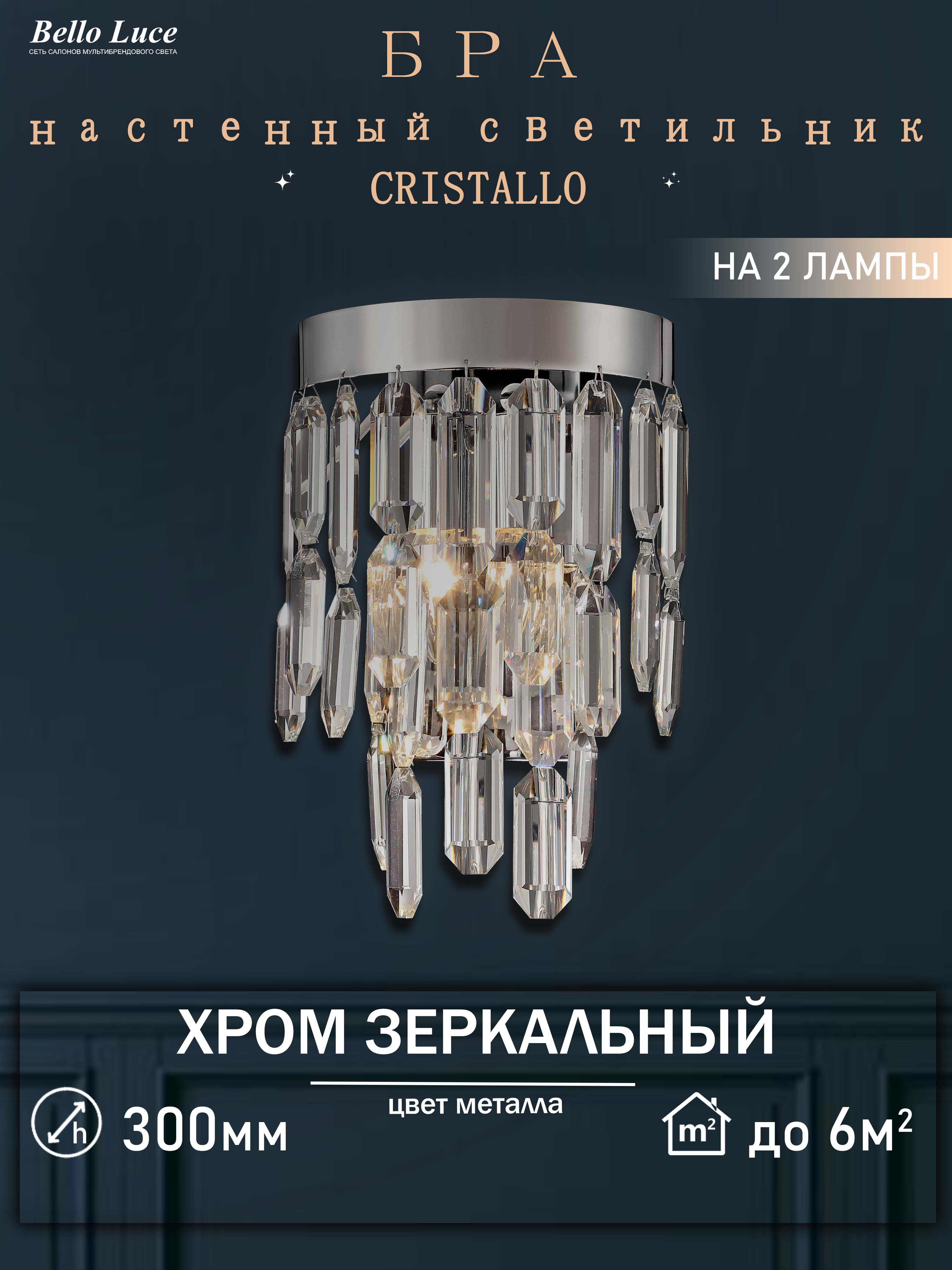 Компания Мегасвет предлагает вам оптом и в розницу Светильник настенный Cristallo хром с прозрачными хрустальными подвесками, бра на 2 лампы E14 по цене 6930 рублей.