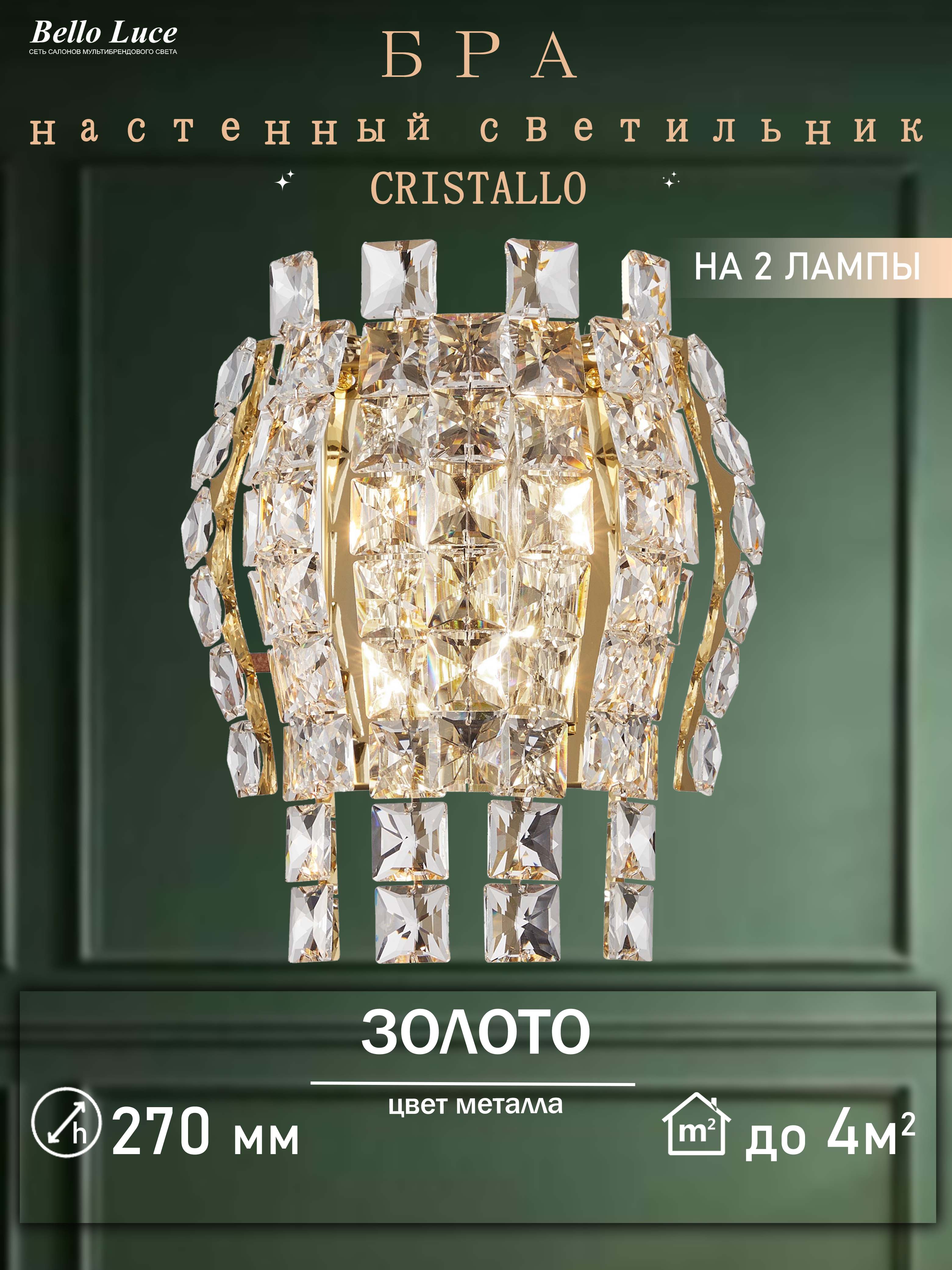 Компания Мегасвет предлагает вам оптом и в розницу Светильник Cristallo хрустальный золото настенный с прозрачным хрусталем бра на 2 лампы E14 по цене 7810 рублей.