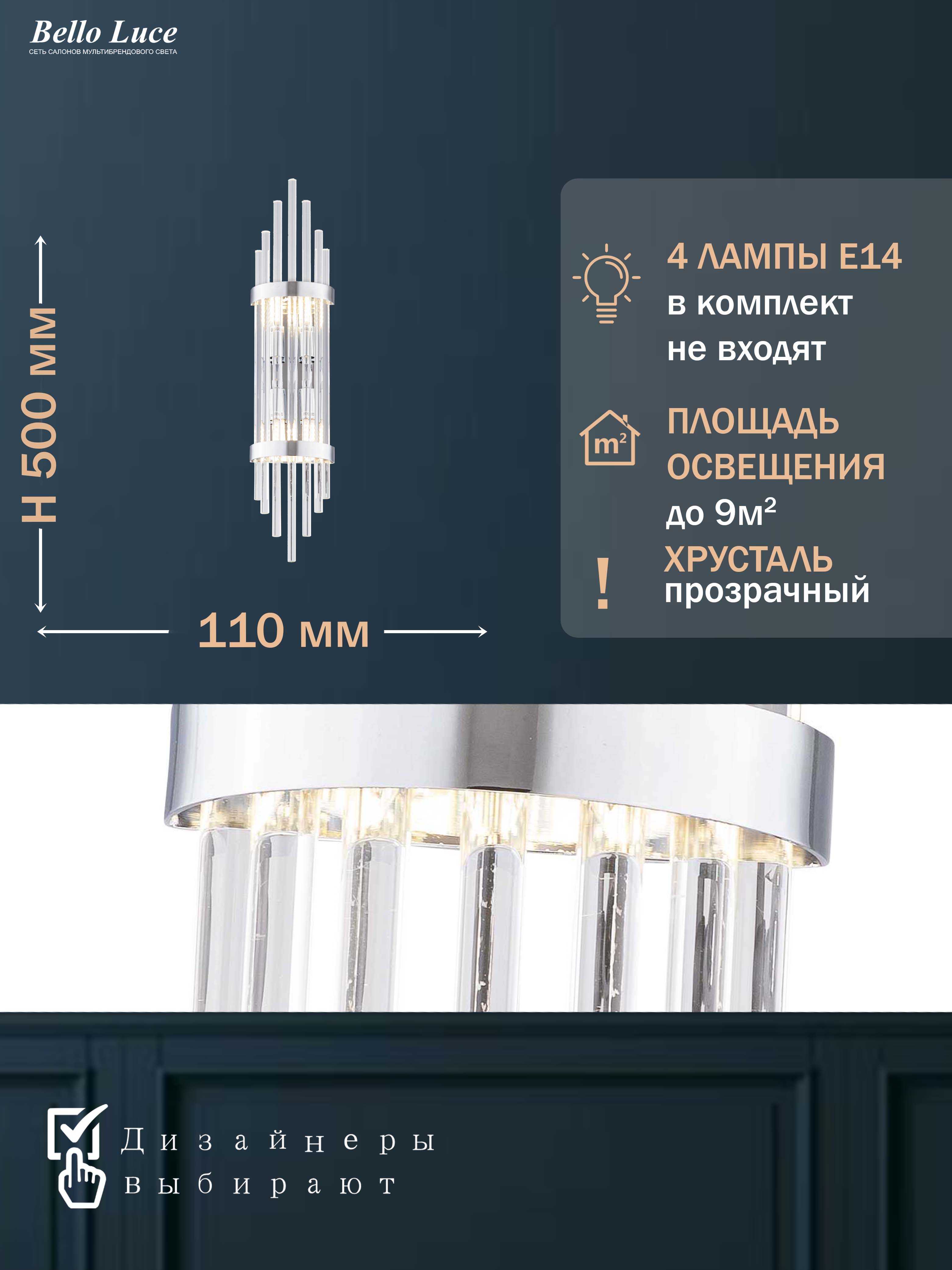 Компания Мегасвет предлагает вам оптом и в розницу Светильник Cristallo хрустальный хром настенный с прозрачным хрусталем бра на 4 лампы E14 по цене 7100 рублей.