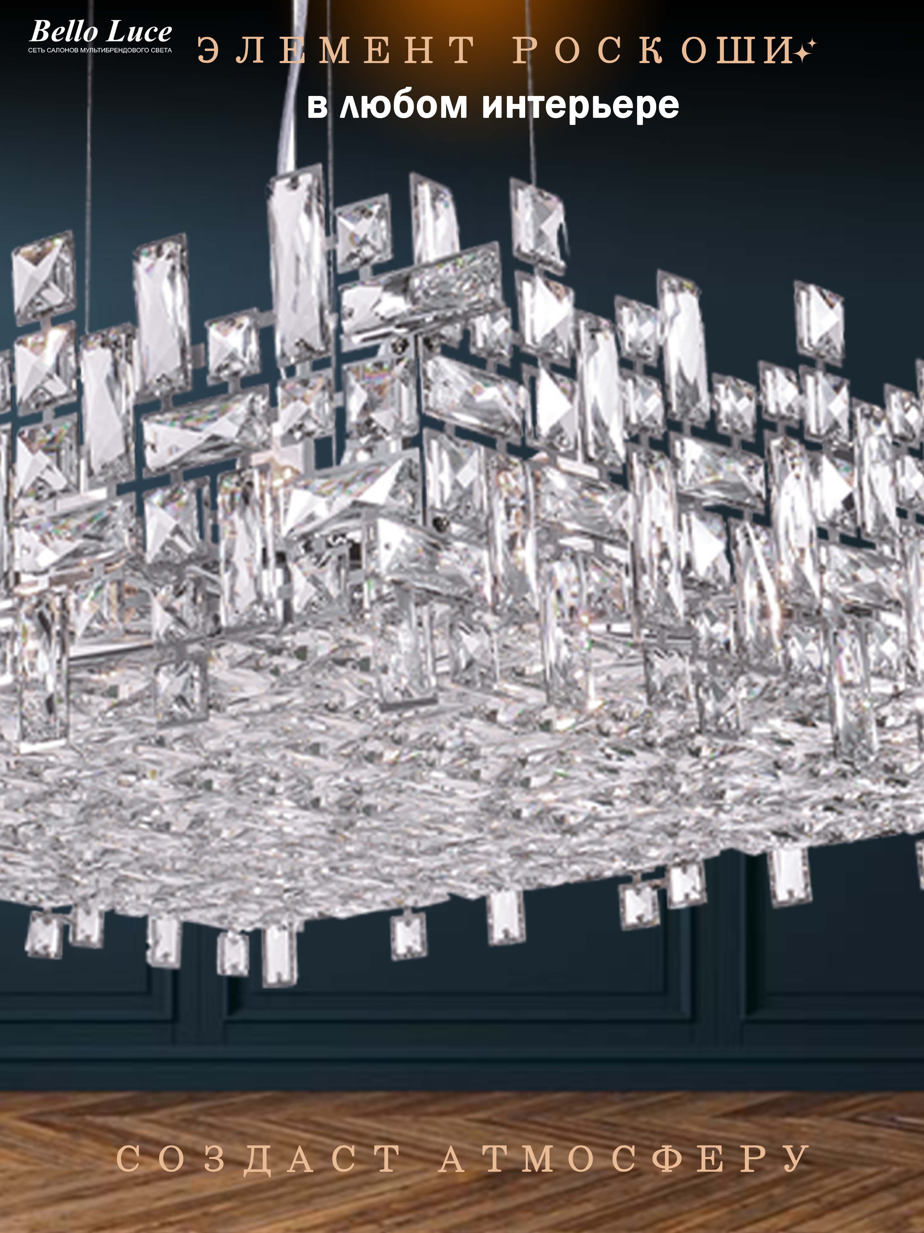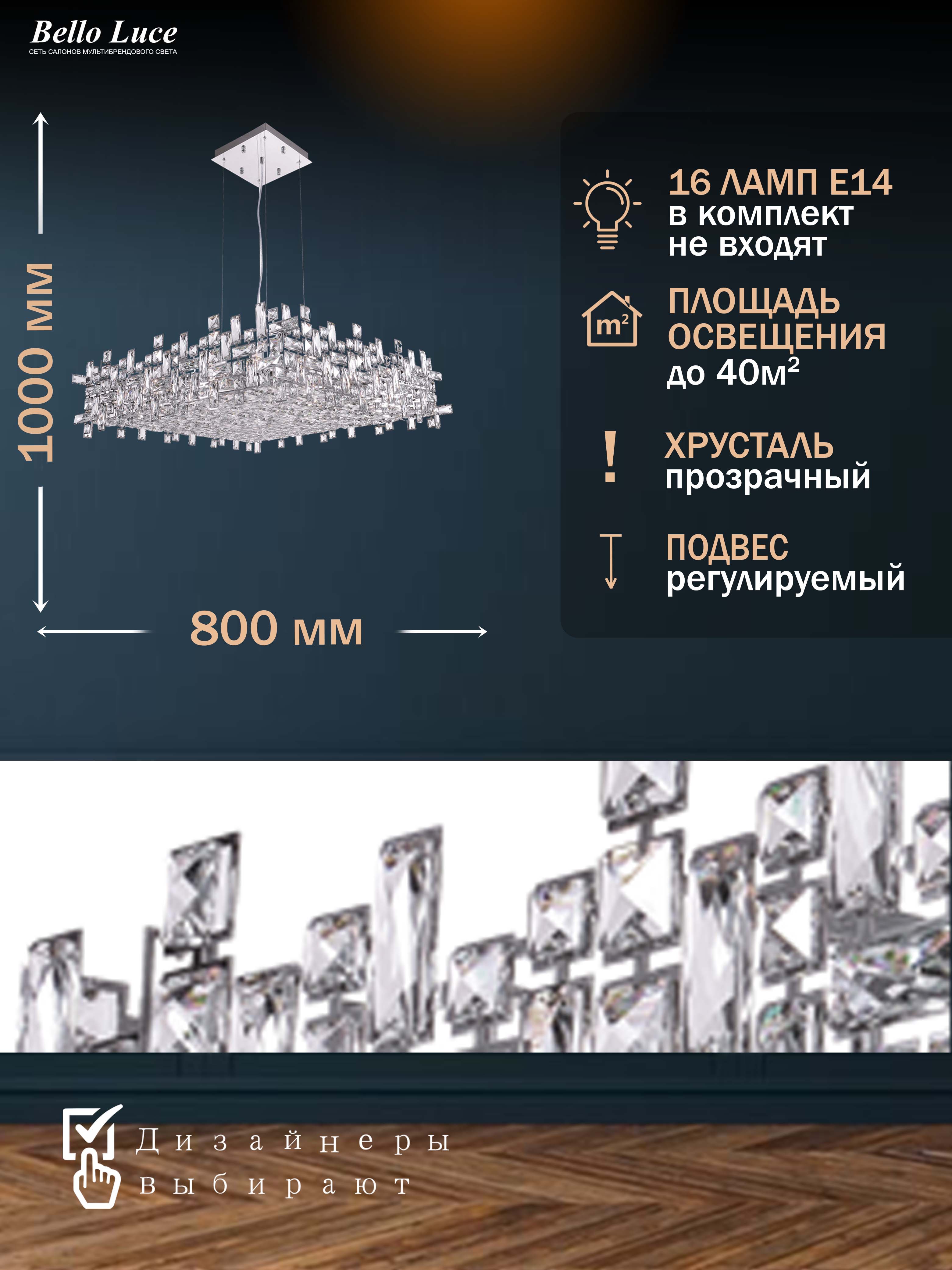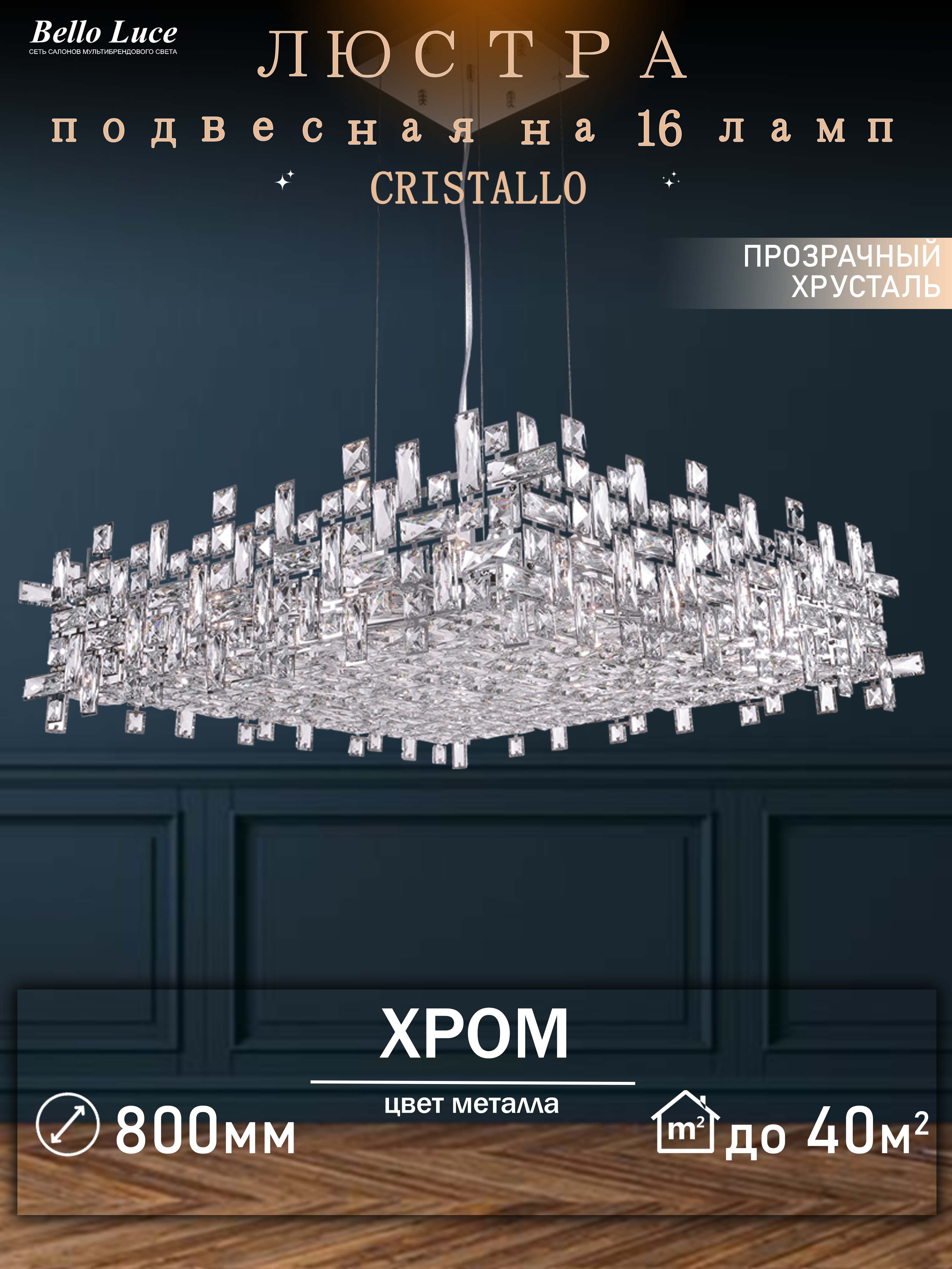 Компания Мегасвет предлагает вам оптом и в розницу Люстра Cristallo хрустальная подвесная хром квадратная с прозрачными хрустальными кристаллами на 16 ламп E14, регулировка по высоте по цене 48191 рублей.