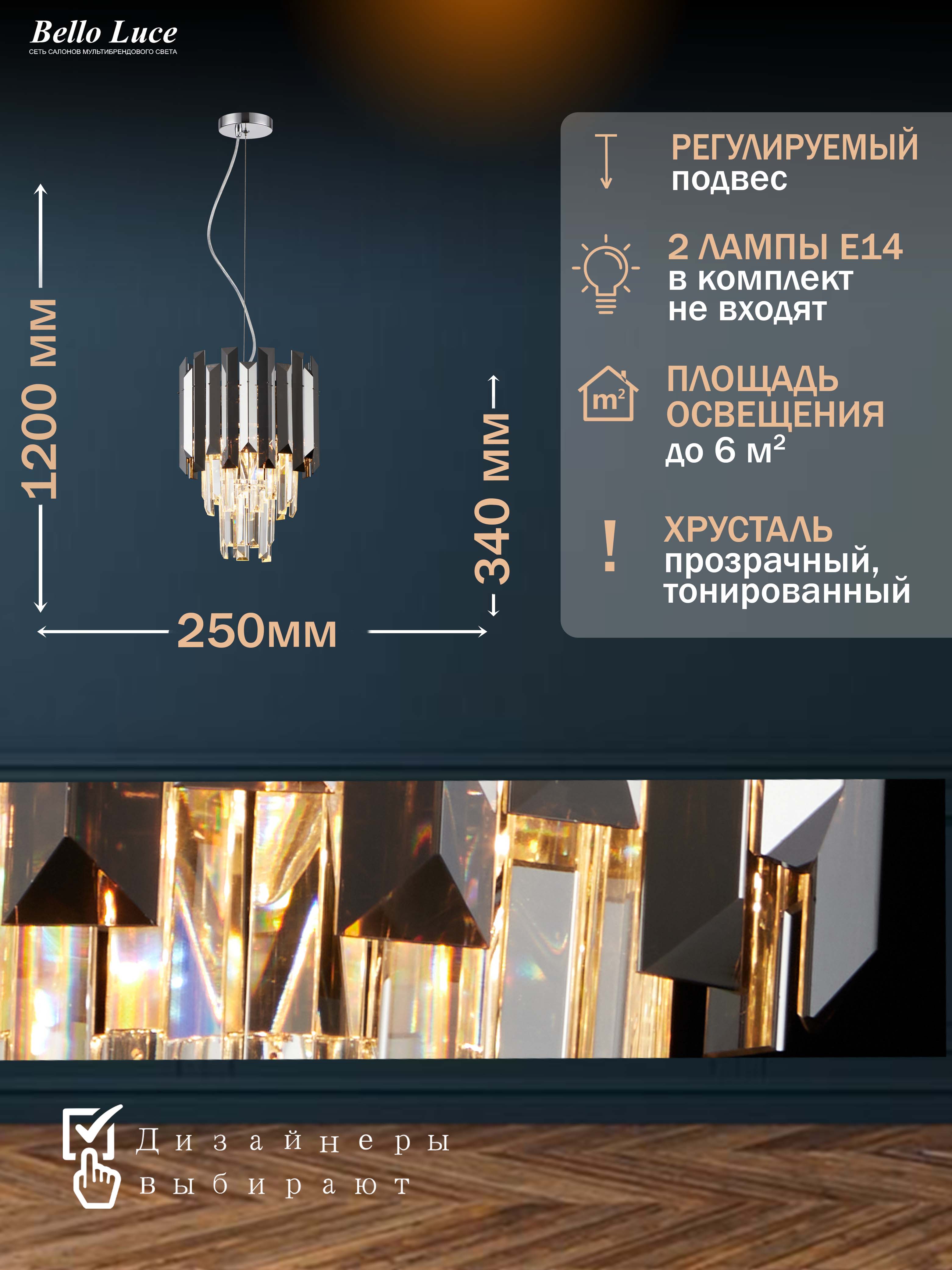 Компания Мегасвет предлагает вам оптом и в розницу Люстра Cristallo хрустальная хром подвесная с тонированными хрустальными подвесками на 2 лампы E14, регулировка по высоте по цене 7400 рублей.