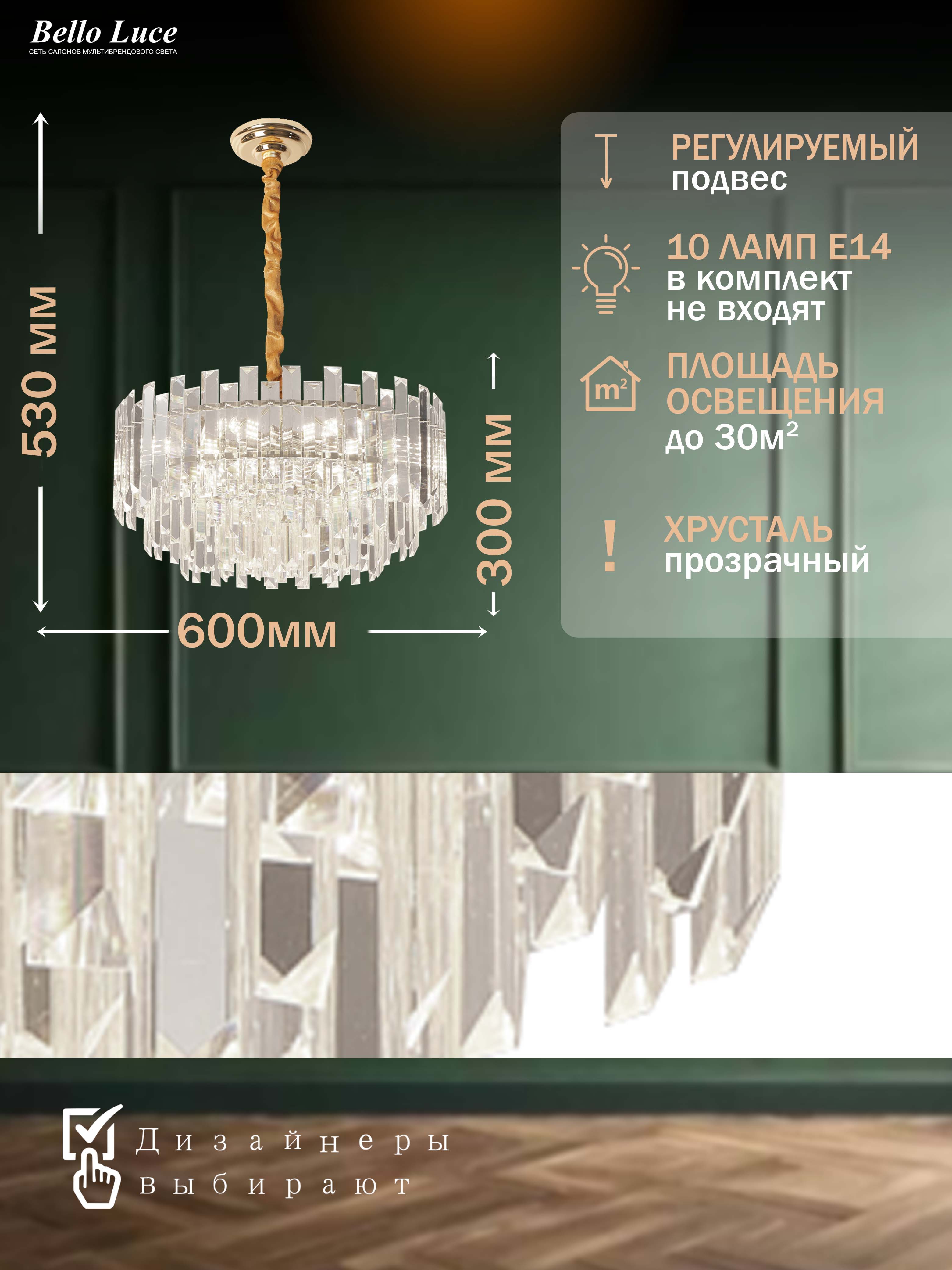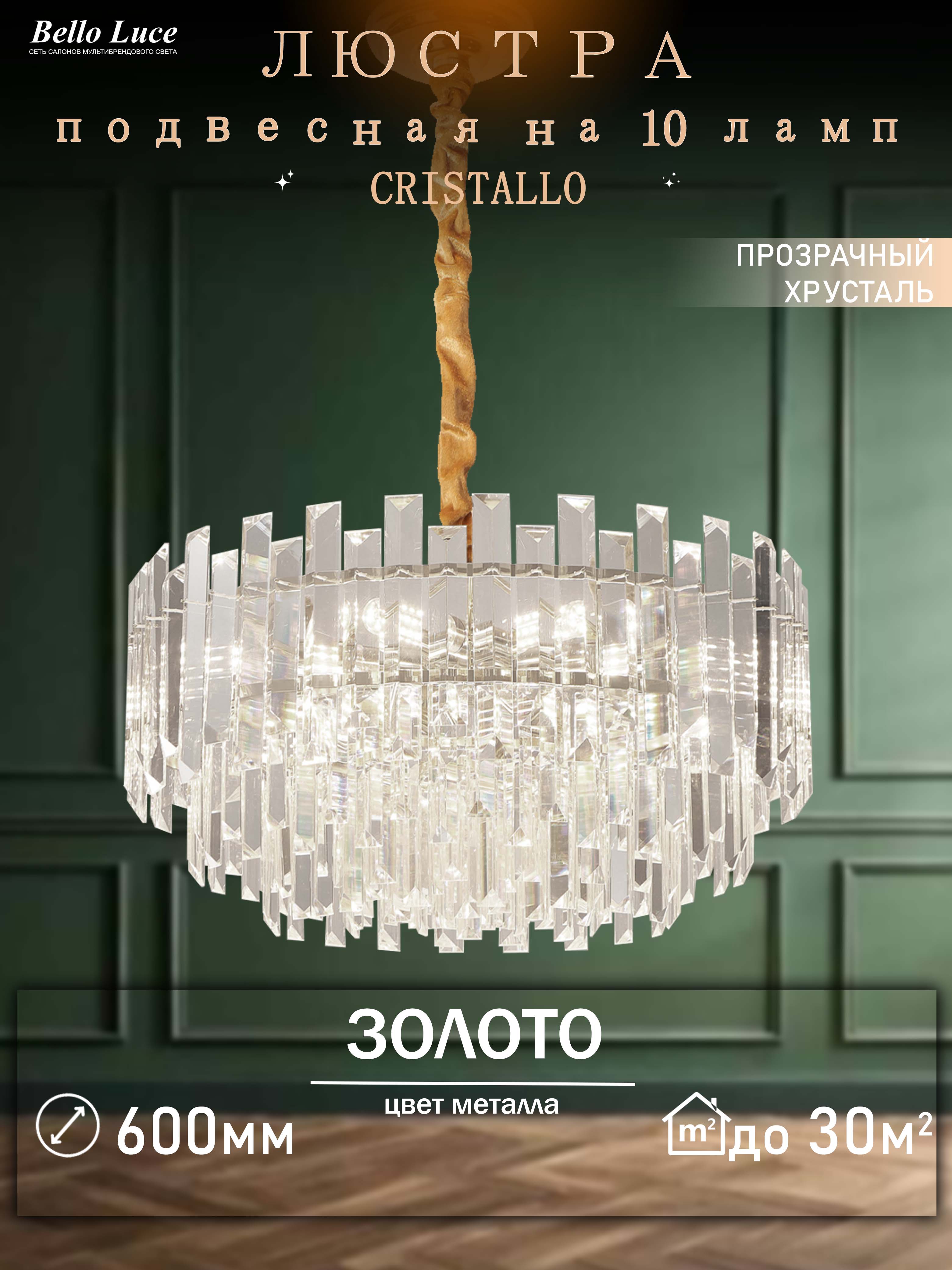 Компания Мегасвет предлагает вам оптом и в розницу Люстра Cristallo хрустальная золото подвесная с прозрачными хрустальными подвесками на 10 ламп E14, регулировка по высоте по цене 25830 рублей.