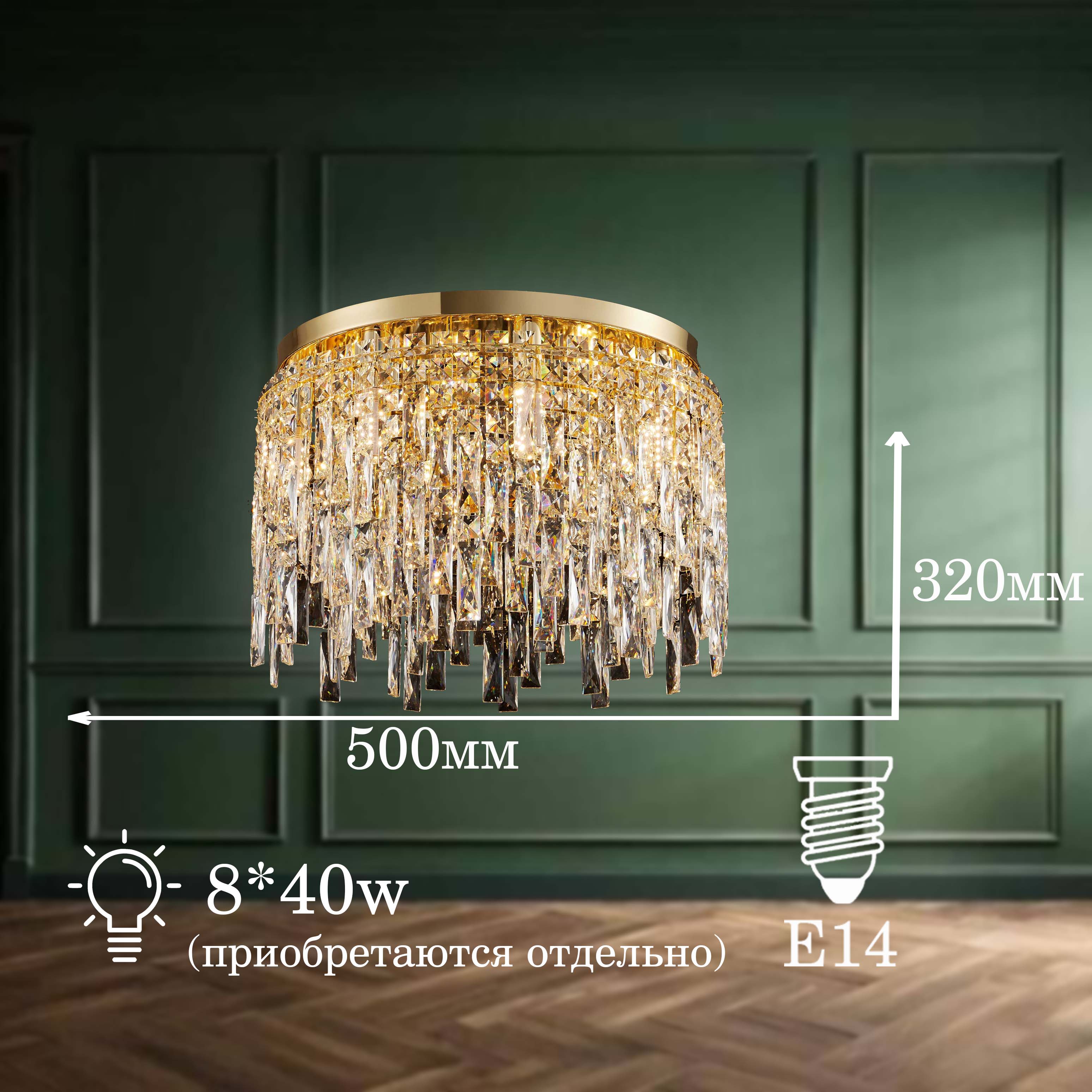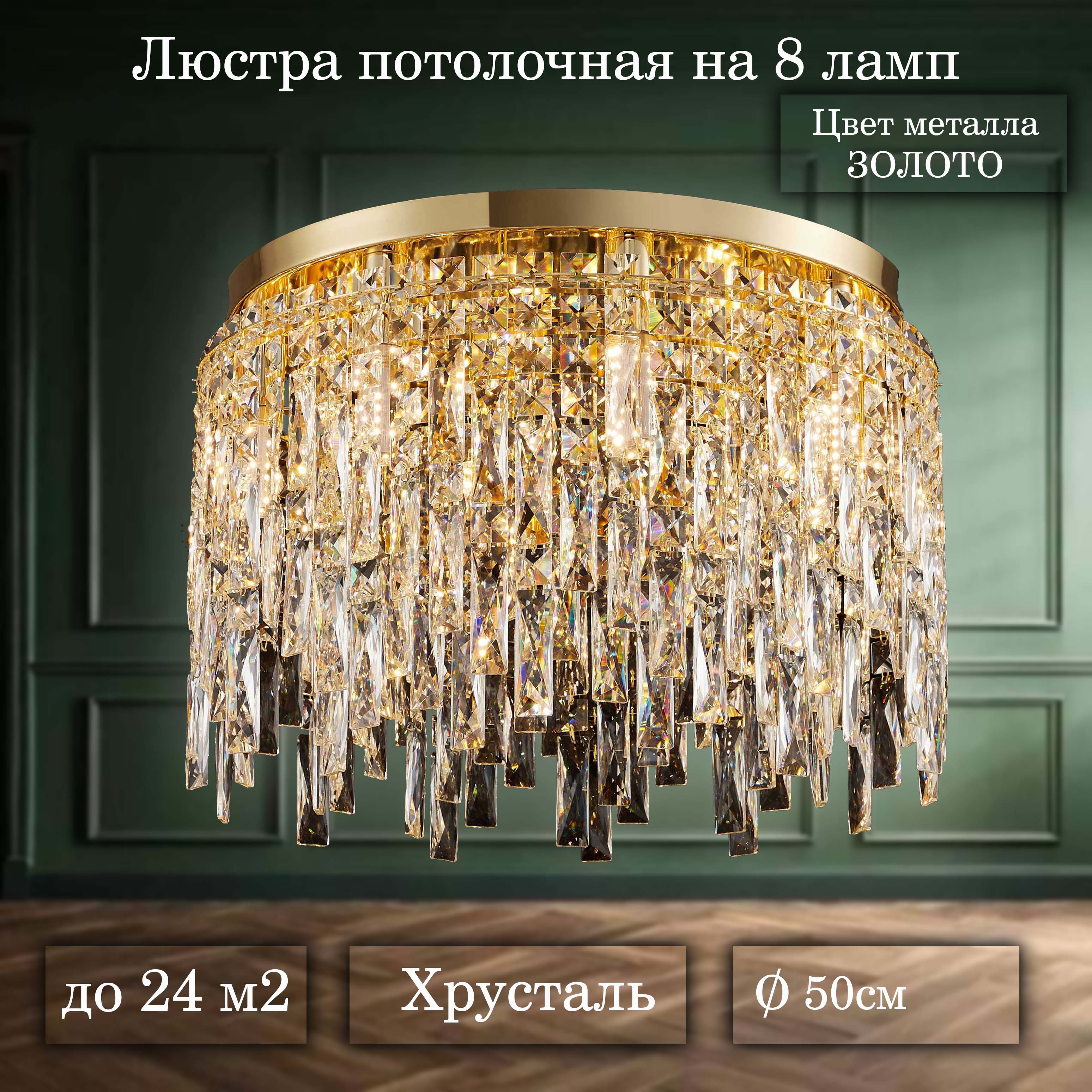 Компания Мегасвет предлагает вам оптом и в розницу Люстра Cristallo хрустальная круглая золото потолочная с прозрачными хрустальными подвесками на 8 ламп E14 по цене 23232 рублей.