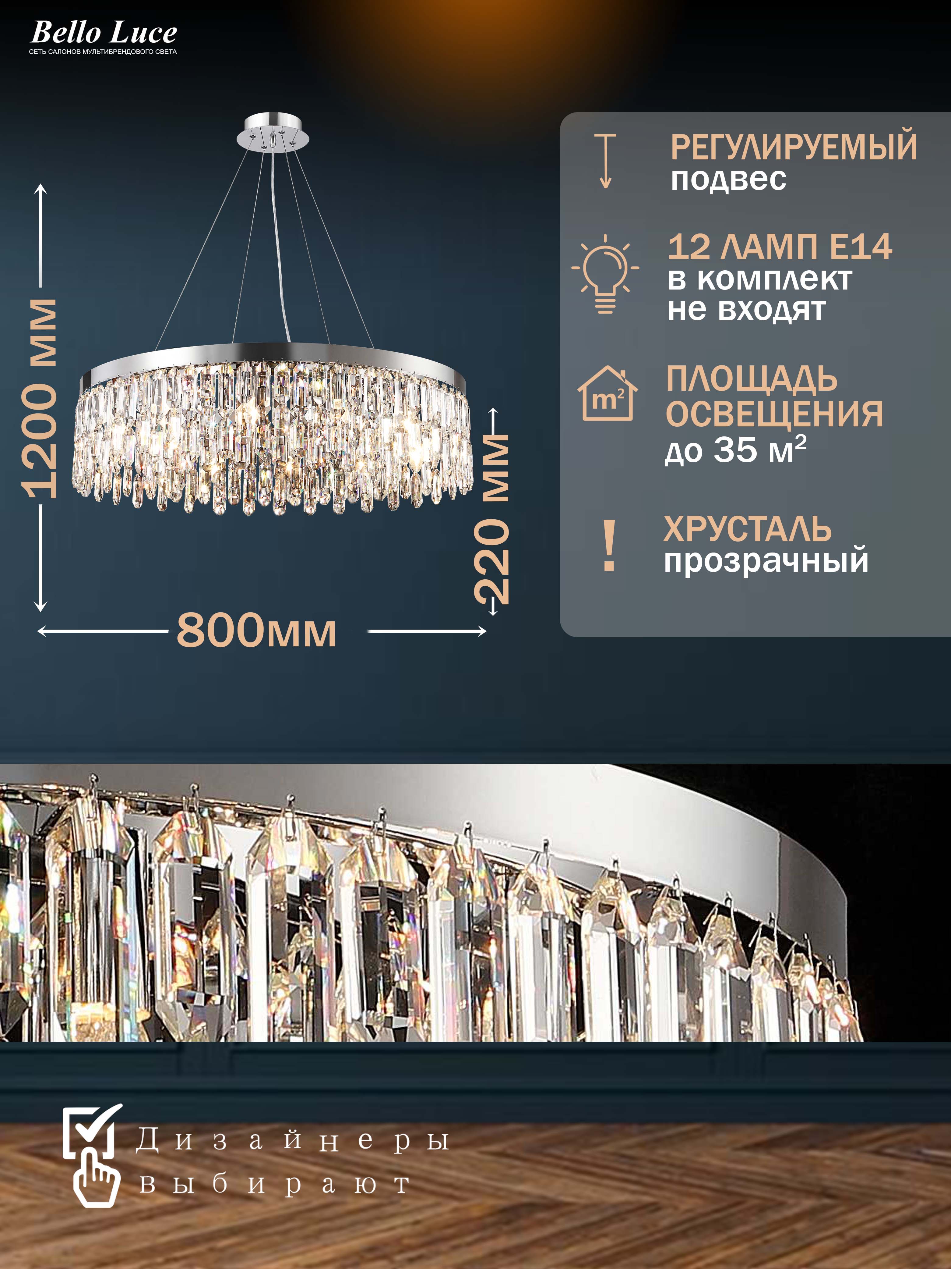 Компания Мегасвет предлагает вам оптом и в розницу Люстра Cristallo хрустальная хром подвесная с прозрачными хрустальными подвесками на 12 ламп E14, регулировка по высоте по цене 51237 рублей.