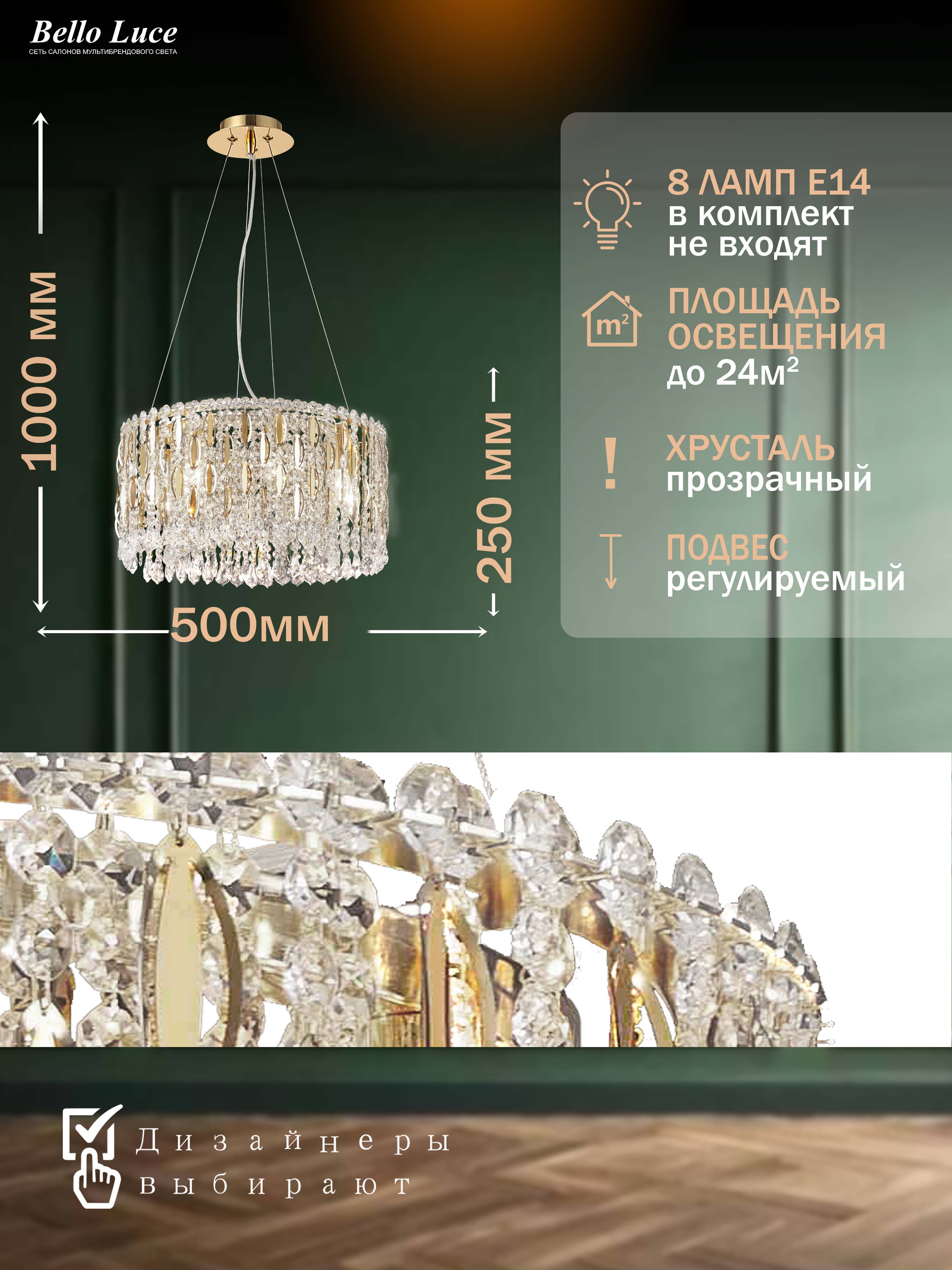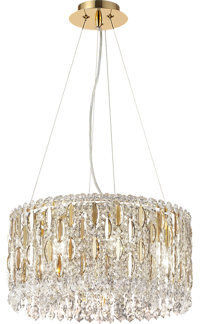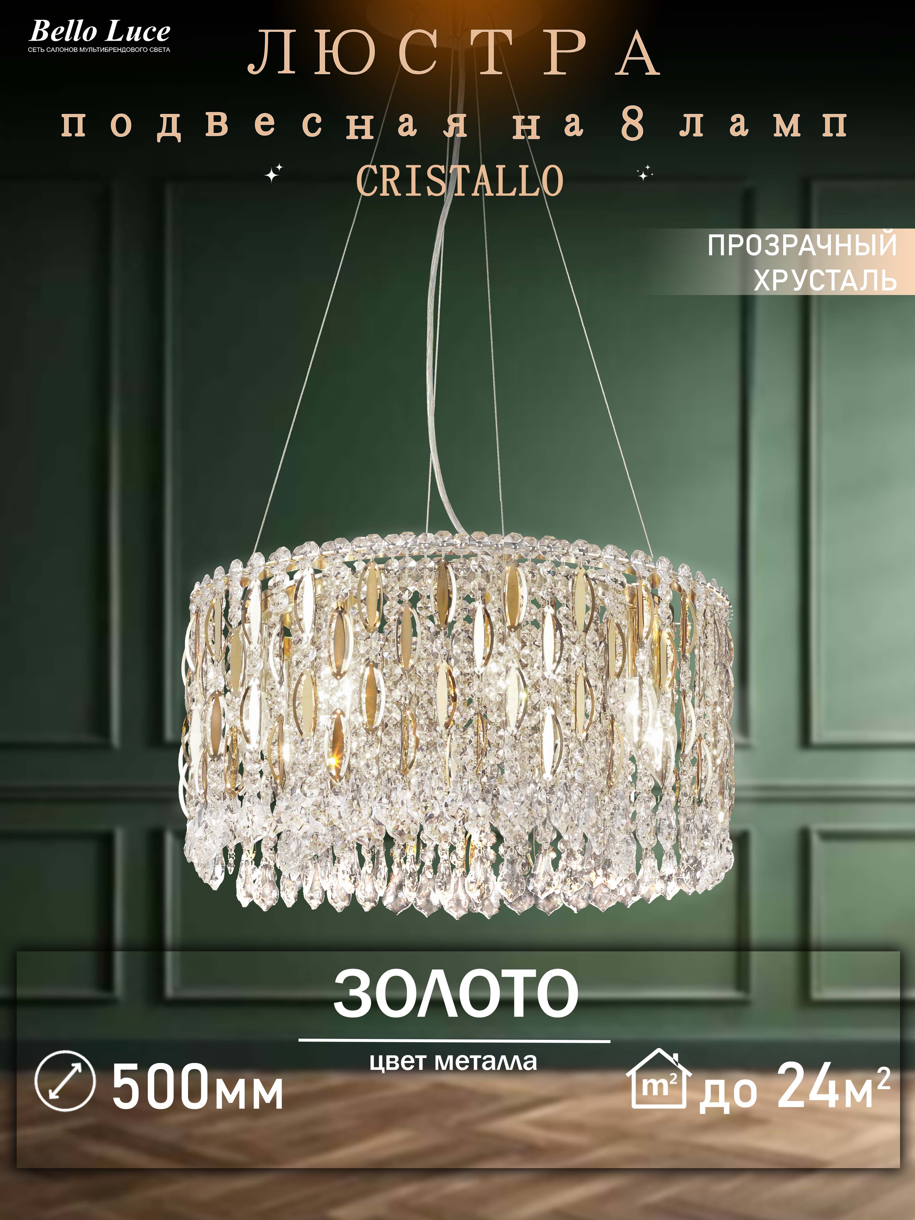 Компания Мегасвет предлагает вам оптом и в розницу Люстра Cristallo хрустальная круглая золото подвесная с прозрачными хрустальными подвесками на 8 ламп E14, регулировка по высоте по цене 30051 рублей.