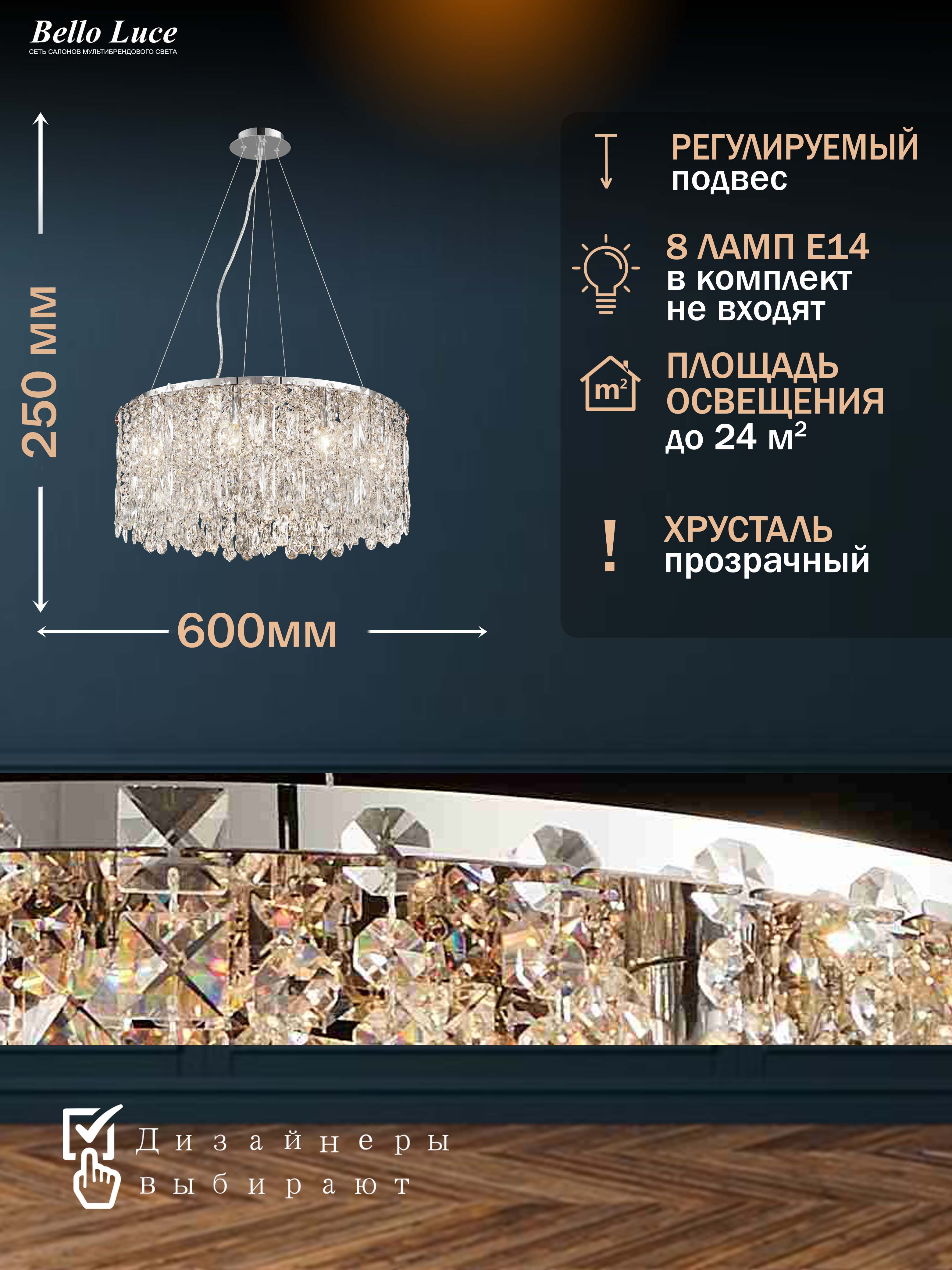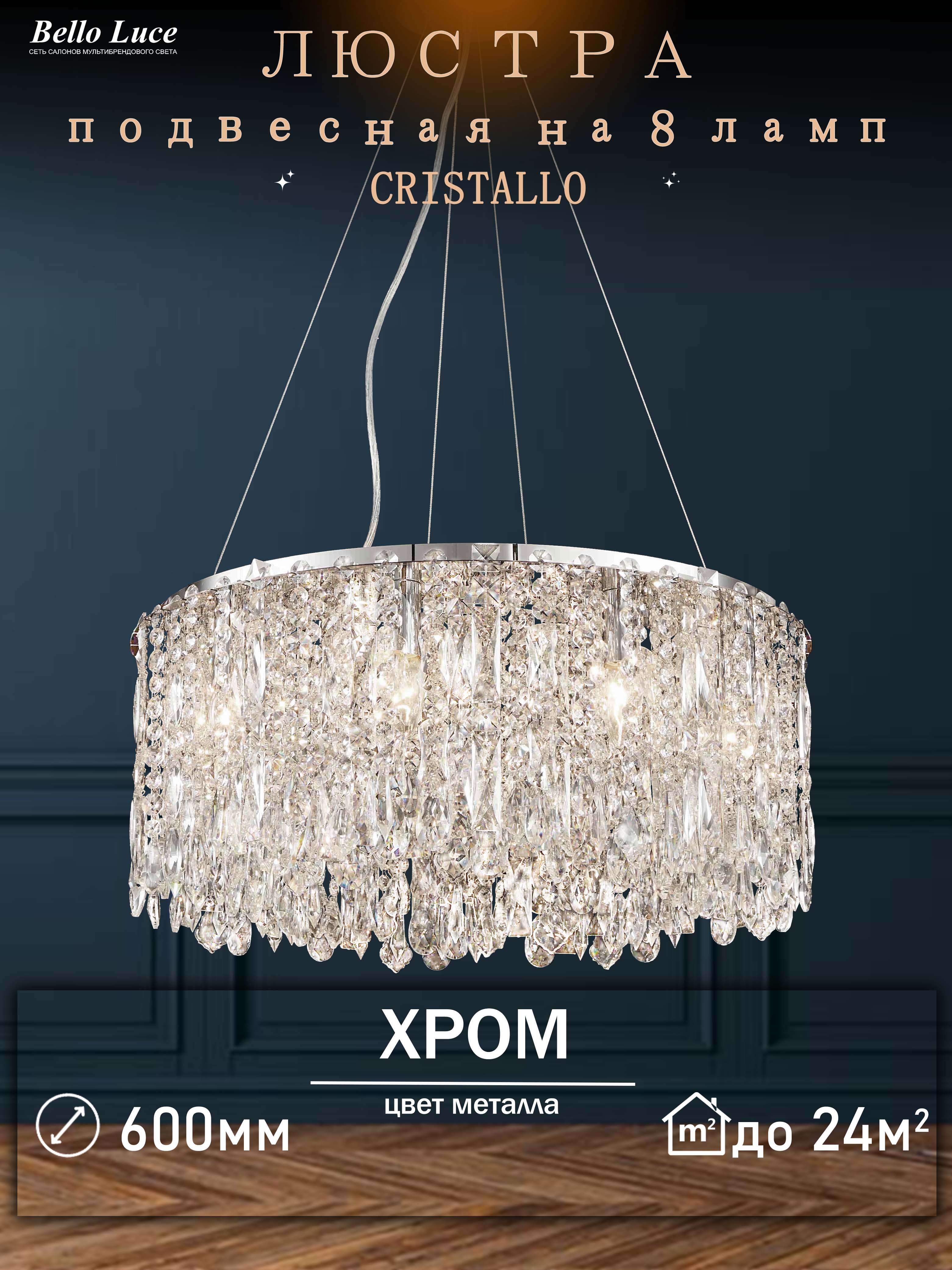 Компания Мегасвет предлагает вам оптом и в розницу Люстра Cristallo хрустальная круглая хром подвесная на 8 ламп E14, регулировка по высоте по цене 38637 рублей.