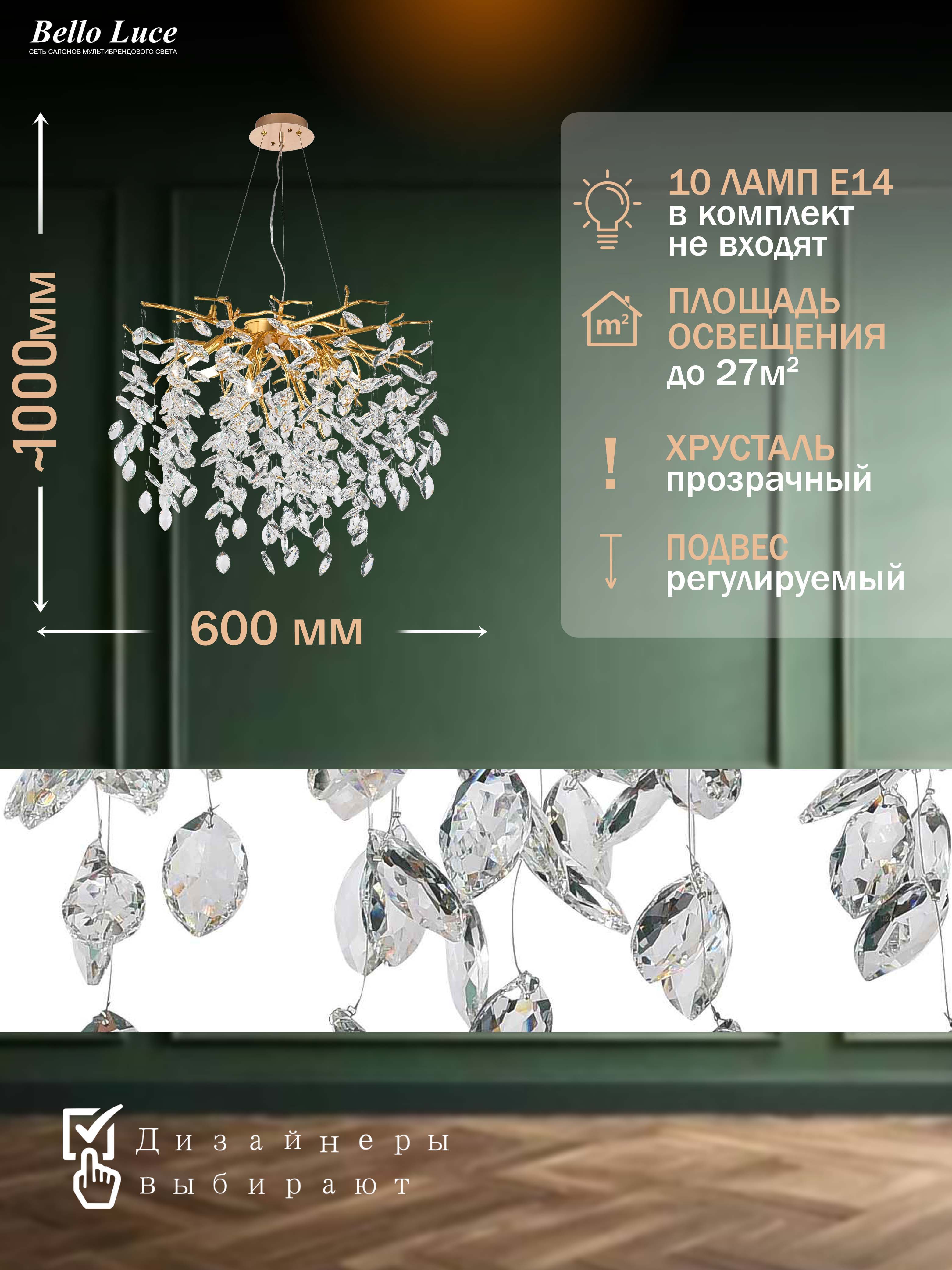 Компания Мегасвет предлагает вам оптом и в розницу Люстра Cristallo хрустальная подвесная золото с прозрачным хрустальным декором на 10 ламп E14, регулировка по высоте по цене 16704 рублей.