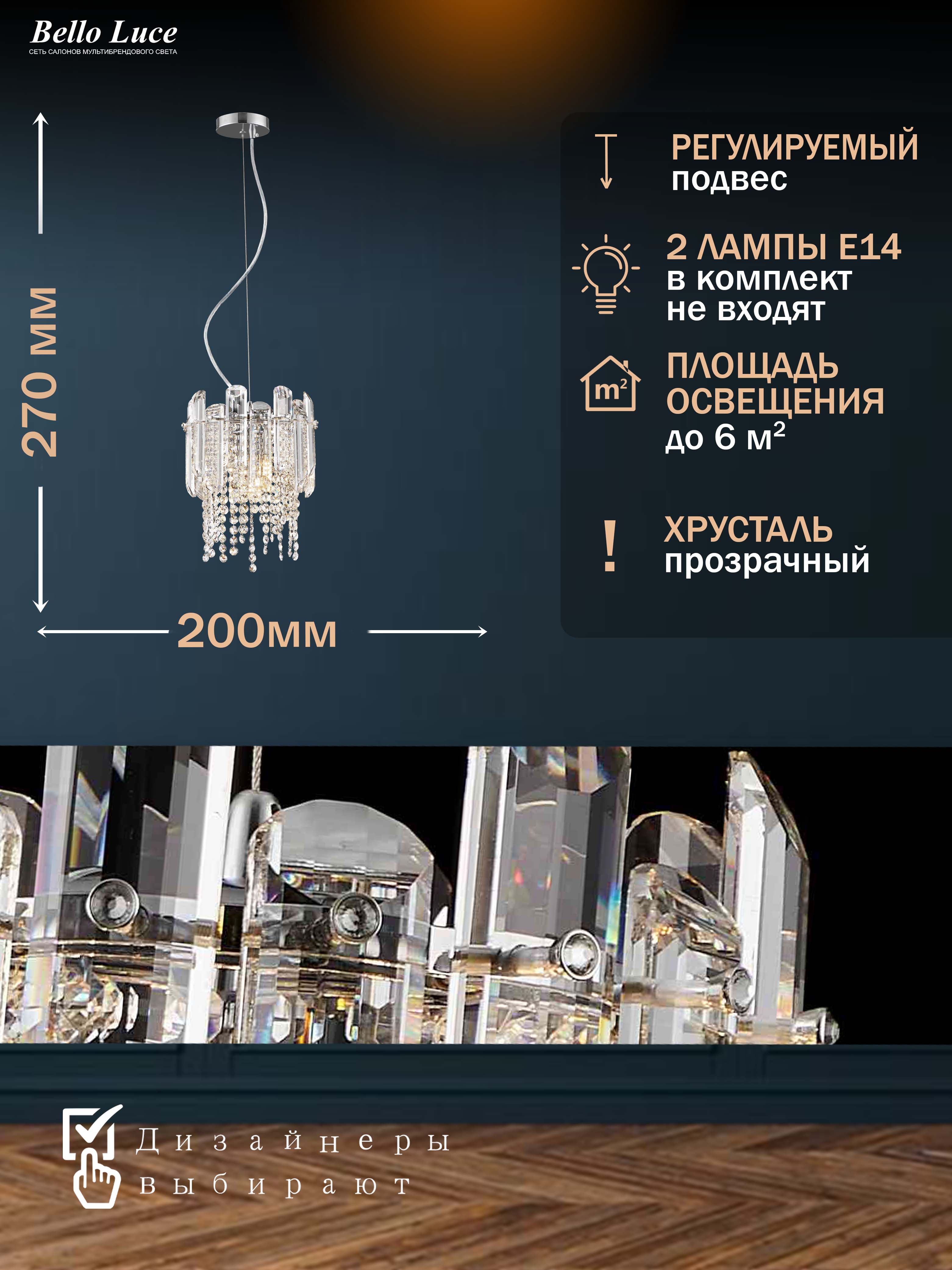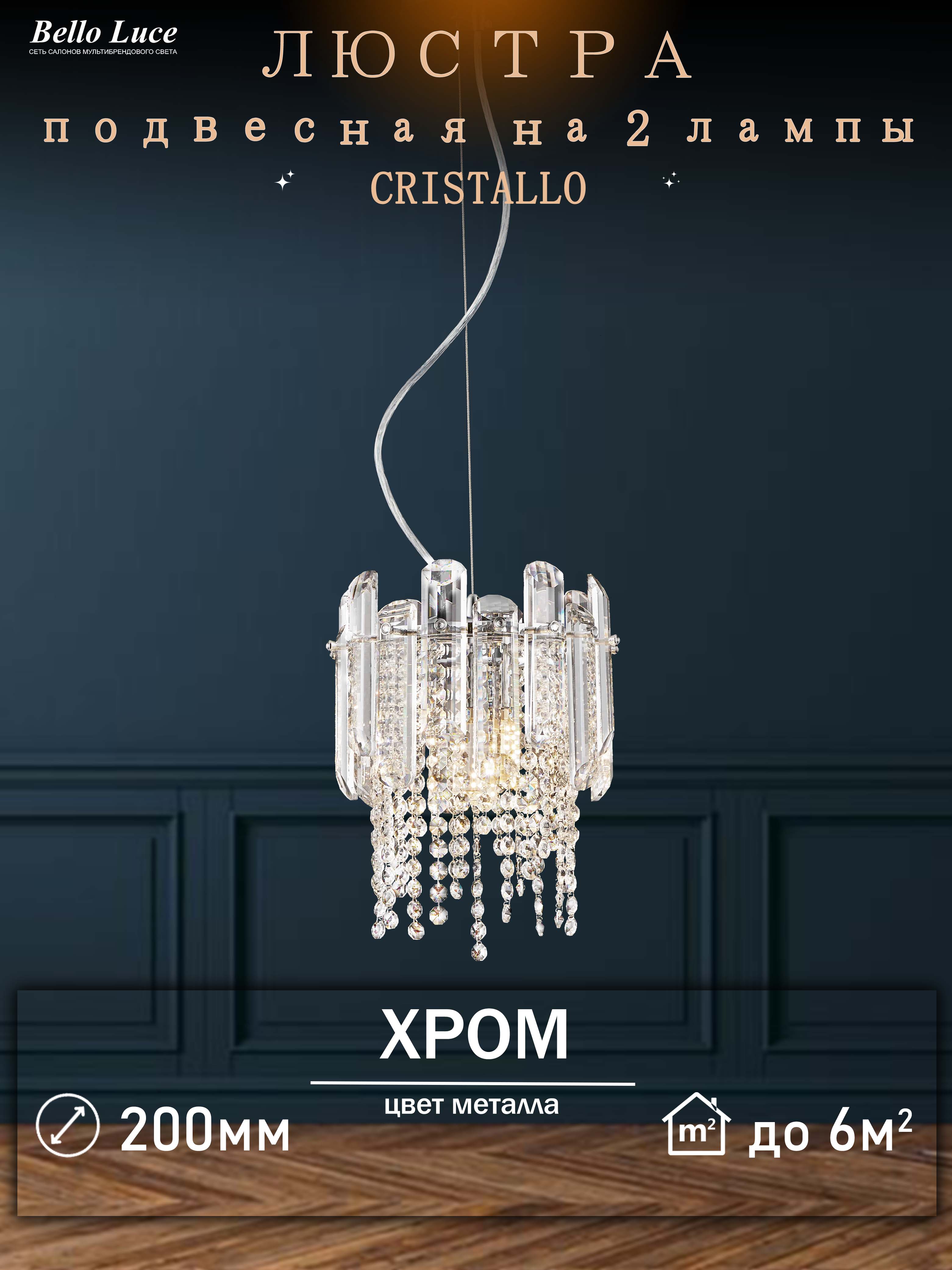 Компания Мегасвет предлагает вам оптом и в розницу Люстра хрустальная подвесная Cristallo хром на 2 лампы E14, регулировка по высоте, с прозрачными хрустальными подвесками по цене 7578 рублей.