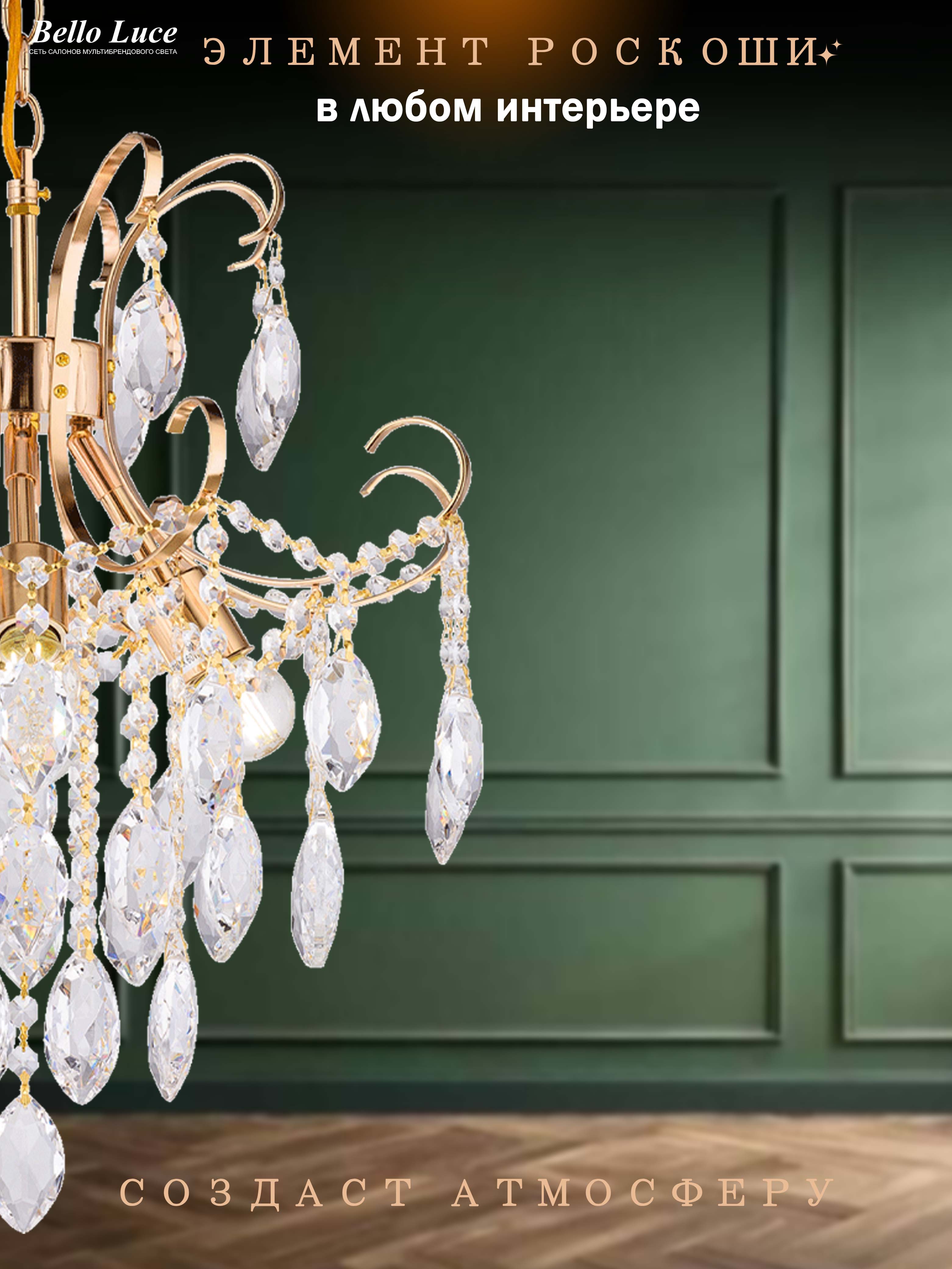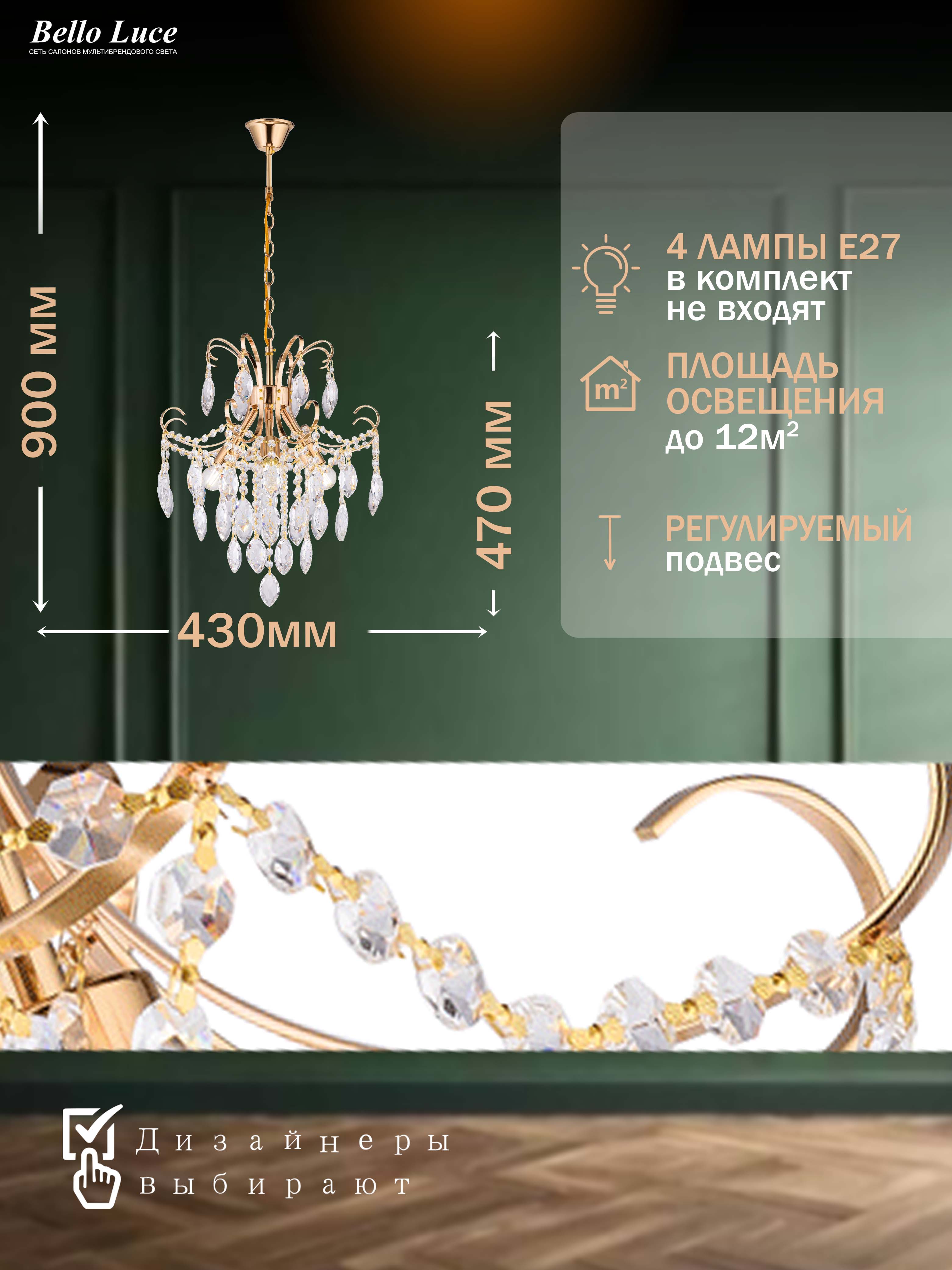 Компания Мегасвет предлагает вам оптом и в розницу Люстра хрустальная золотая подвесная круглая с прозрачными хрустальными подвесками на 4 лампы E27, регулировка по высоте по цене 8010 рублей.