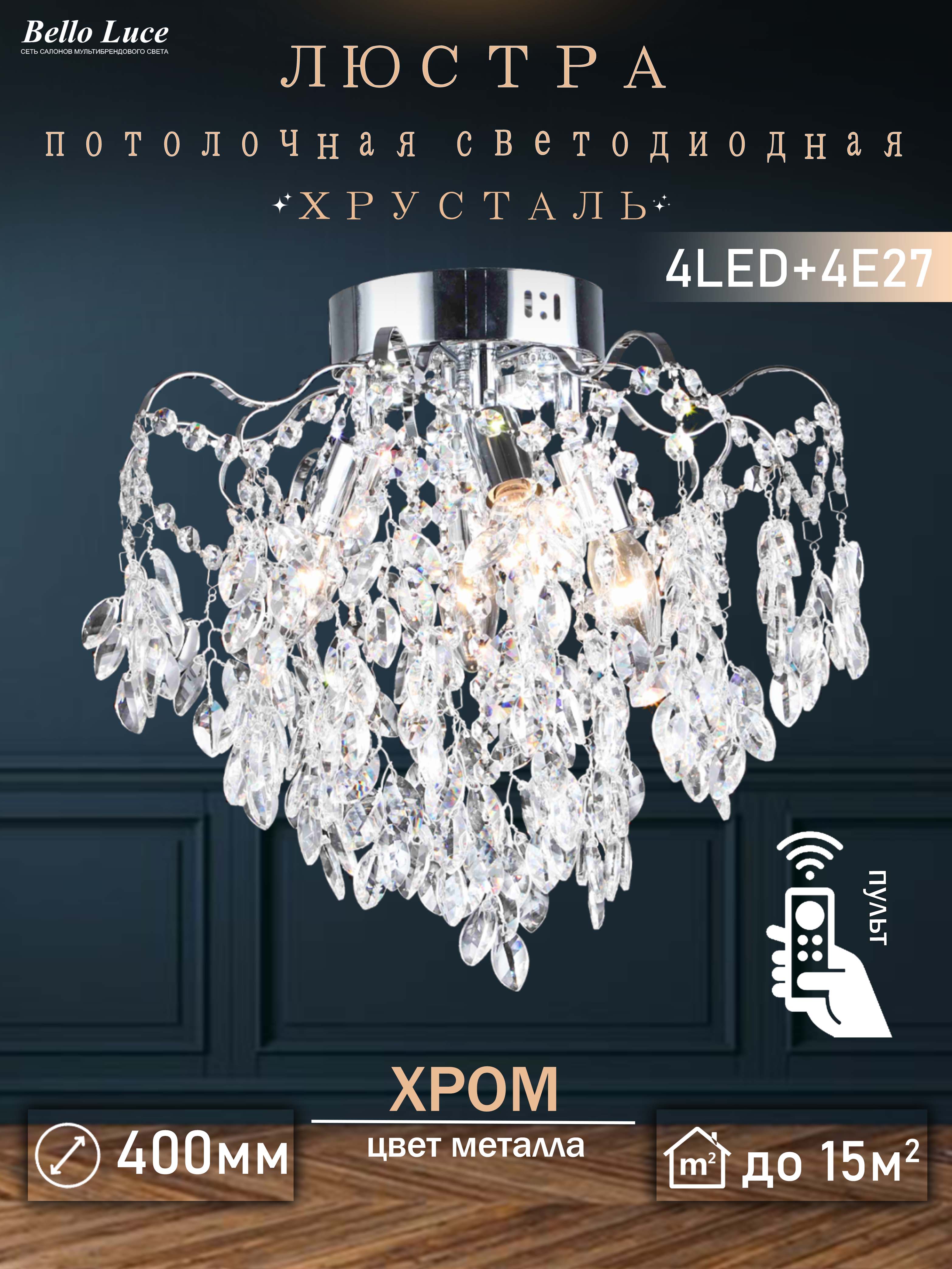 Компания Мегасвет предлагает вам оптом и в розницу Люстра хрустальная потолочная с подсветкой с пультом круглая хром с прозрачными хрустальными подвесками на 4Led модулей + 4 E27 по цене 10990 рублей.