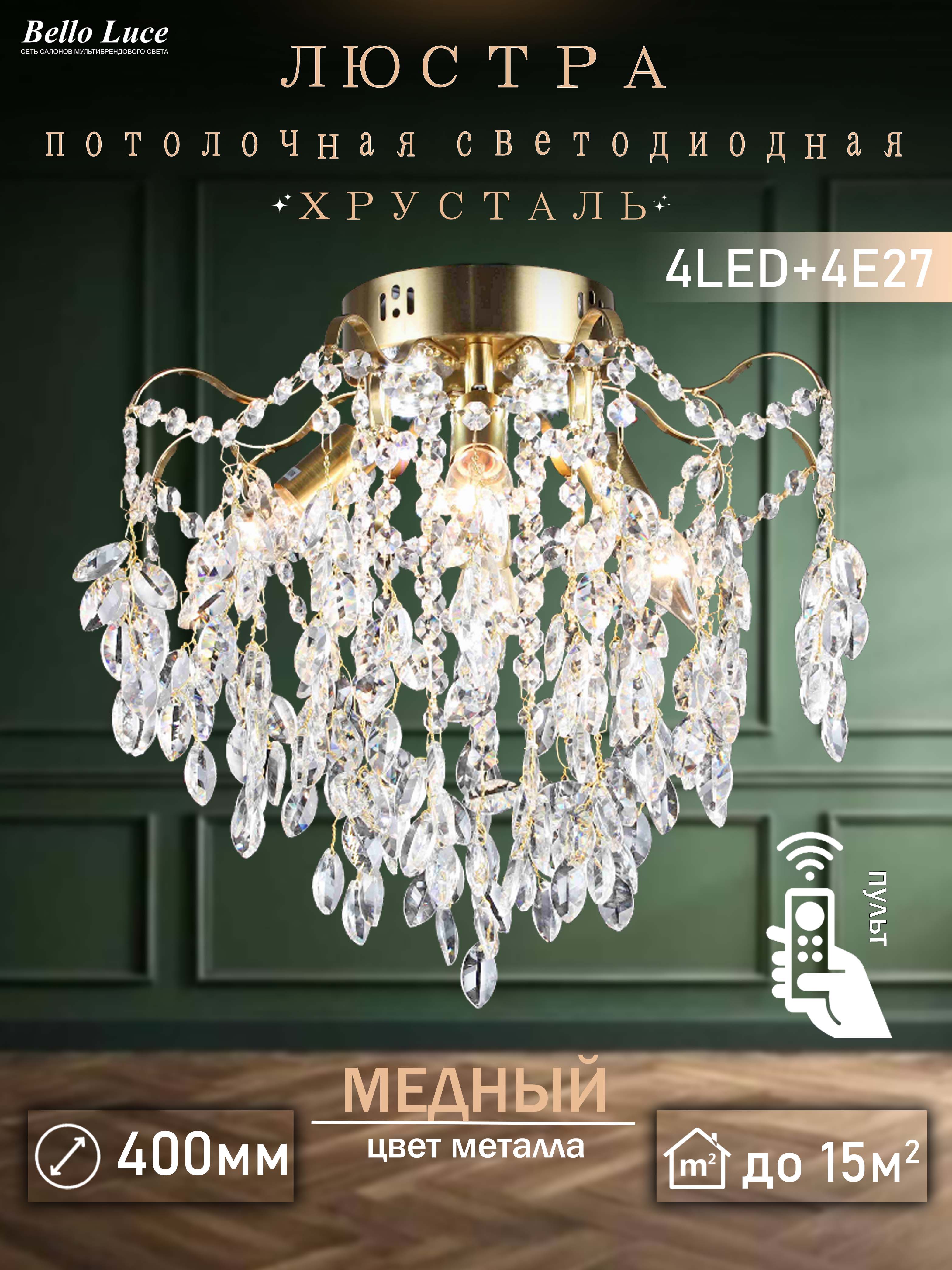 Компания Мегасвет предлагает вам оптом и в розницу Люстра хрустальная потолочная с подсветкой с пультом круглая медь с прозрачными хрустальными подвесками на 4Led модулей + 4 E27 по цене 10990 рублей.